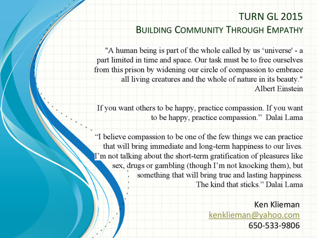 is part of the whole called by us ‘universe' - a part limited in time and space. Our task must be to free ourselves from this prison by widening our circle of compassion to embrace all living creatures and the whole of nature in its beauty." Albert Einstein If you want others to be happy, practice compassion. If you want to be happy, practice compassion.” Dalai Lama “I believe compassion to be one of the few things we can practice that will bring immediate and long-term happiness to our lives. I’m not talking about the short-term gratification of pleasures like sex, drugs or gambling (though I’m not knocking them), but something that will bring true and lasting happiness. The kind that sticks.” Dalai Lama Ken Klieman [email protected] 650-533-9806