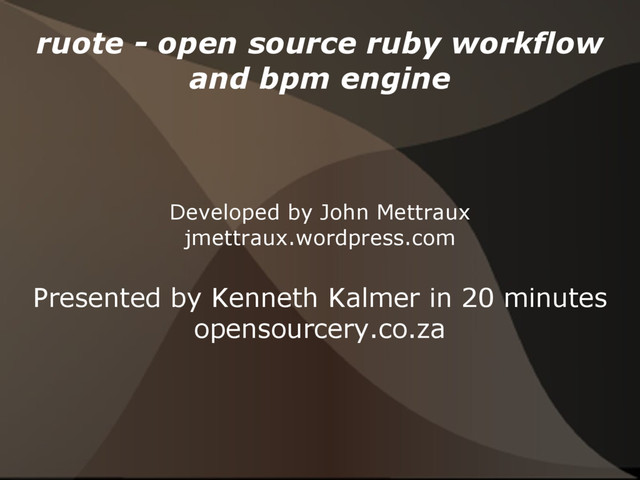 bundled with ruote • Added support for daemonizing ruote-rest • In talks on refactoring ruote-rest to become preferred “Rails-friendly” implementation of ruote