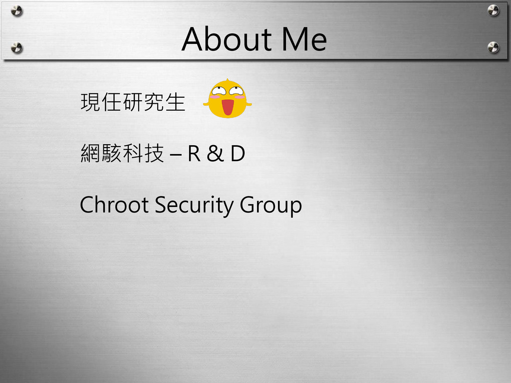 About Me 現任研究生 網駭科技 – R & D Chroot Security