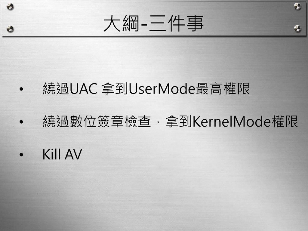 大綱-三件事 • 繞過UAC 拿到UserMode最高權限 • 繞過數位簽章檢查,拿到KernelMode權限 • Kill AV