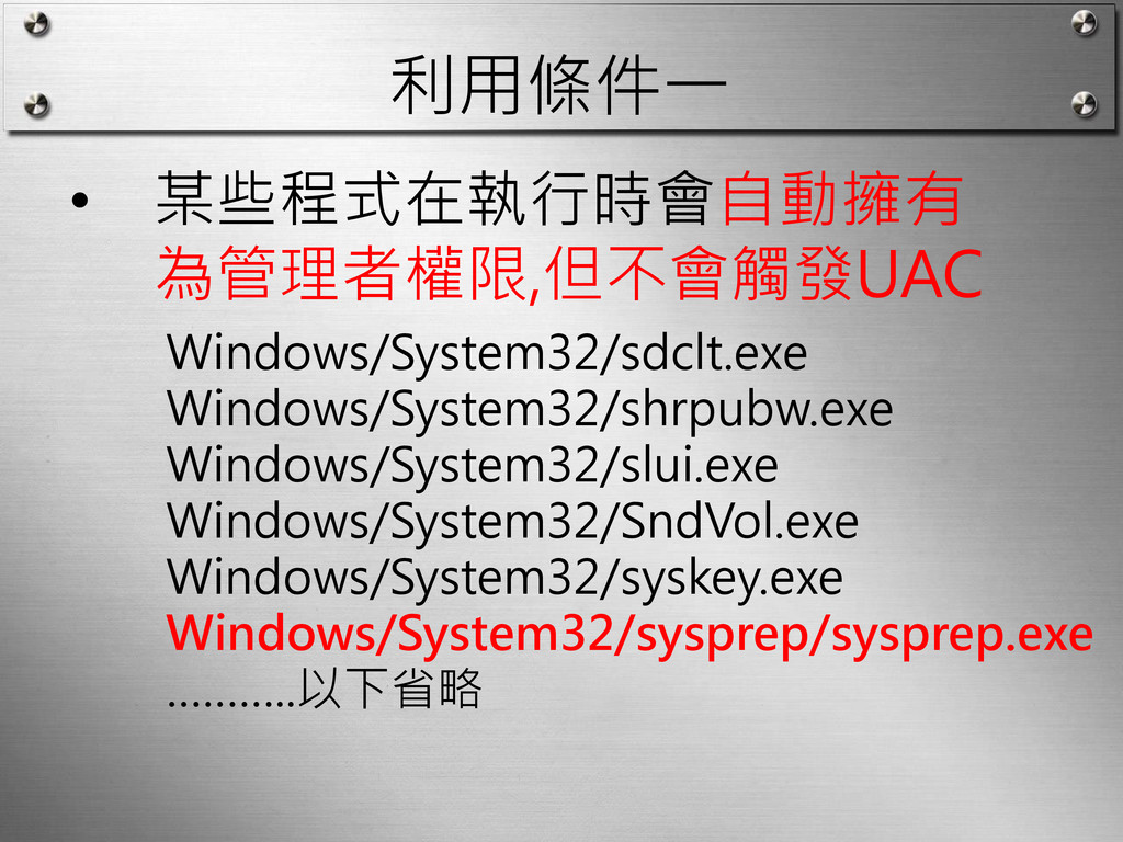利用條件一 • 某些程式在執行時會自動擁有 為管理者權限,但不會觸發UAC Windows/System32/sdclt.exe Windows/System32/shrpubw.exe Windows/System32/slui.exe Windows/System32/SndVol.exe Windows/System32/syskey.exe Windows/System32/sysprep/sysprep.exe