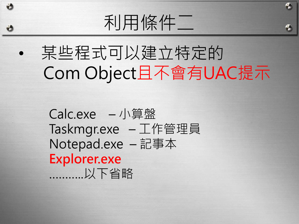 利用條件二 • 某些程式可以建立特定的 Com Object且不會有UAC提示 Calc.exe – 小算盤 Taskmgr.exe –