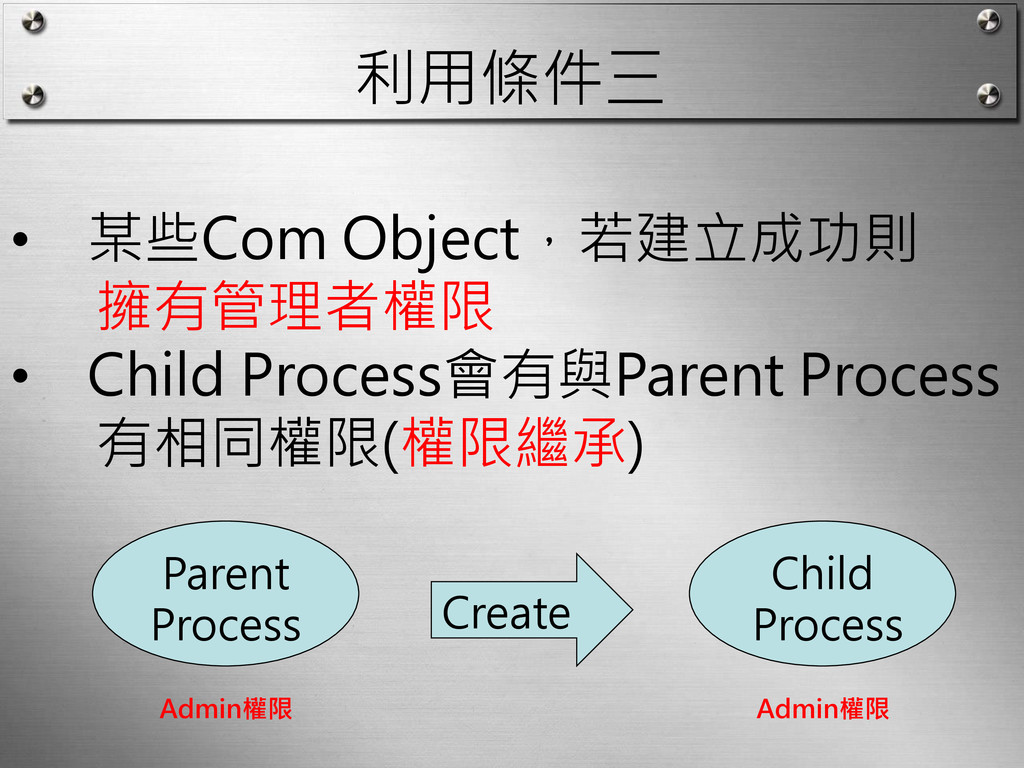 利用條件三 • 某些Com Object,若建立成功則 擁有管理者權限 • Child Process會有與Parent Process 有相同權限(權限繼承)