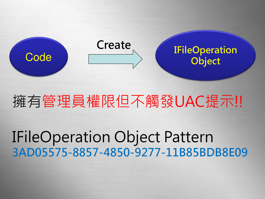 擁有管理員權限但不觸發UAC提示!! IFileOperation Object Pattern 3AD05575-8857-4850-9277-11B85BDB8E09 Code IFileOperation Object Create