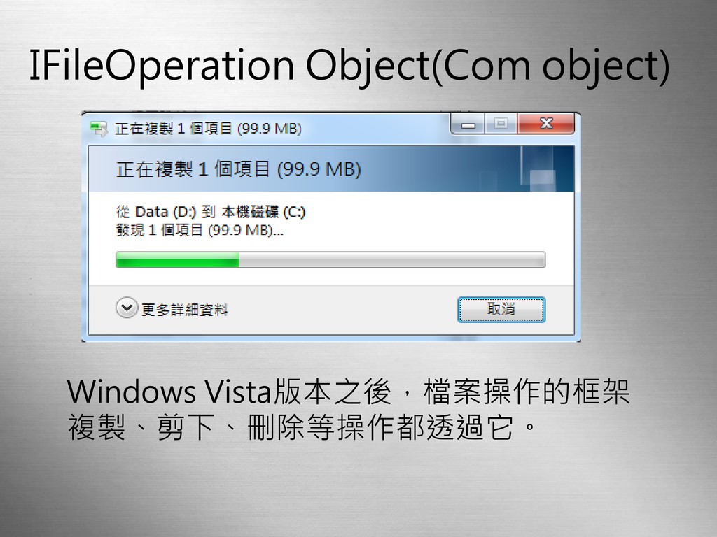 IFileOperation Object(Com object) Windows Vista版本之後,檔案操作的框架 複製、剪下、刪除等操作都透過它。