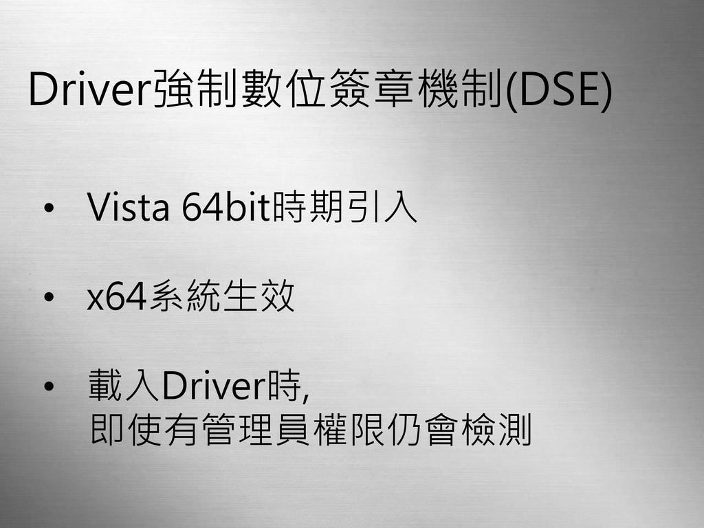 Driver強制數位簽章機制(DSE) • Vista 64bit時期引入 • x64系統生效 • 載入Driver時, 即使有管理員權限仍會檢測