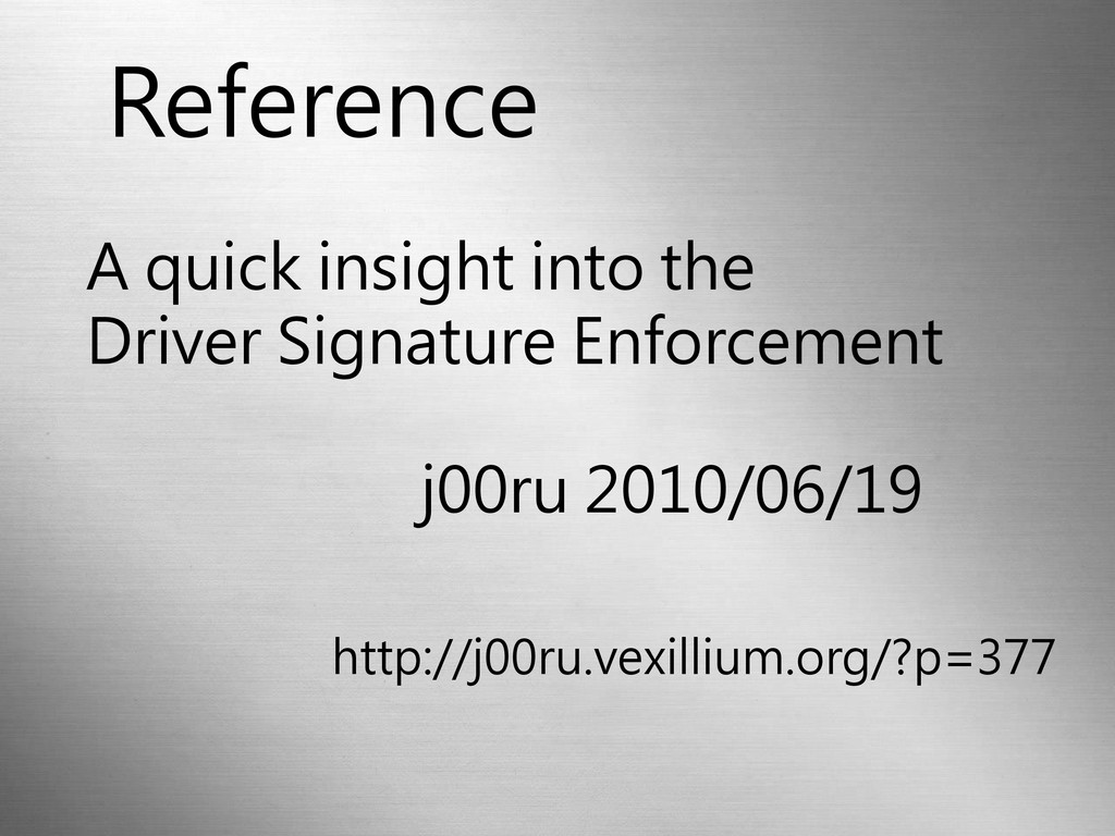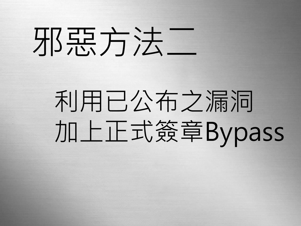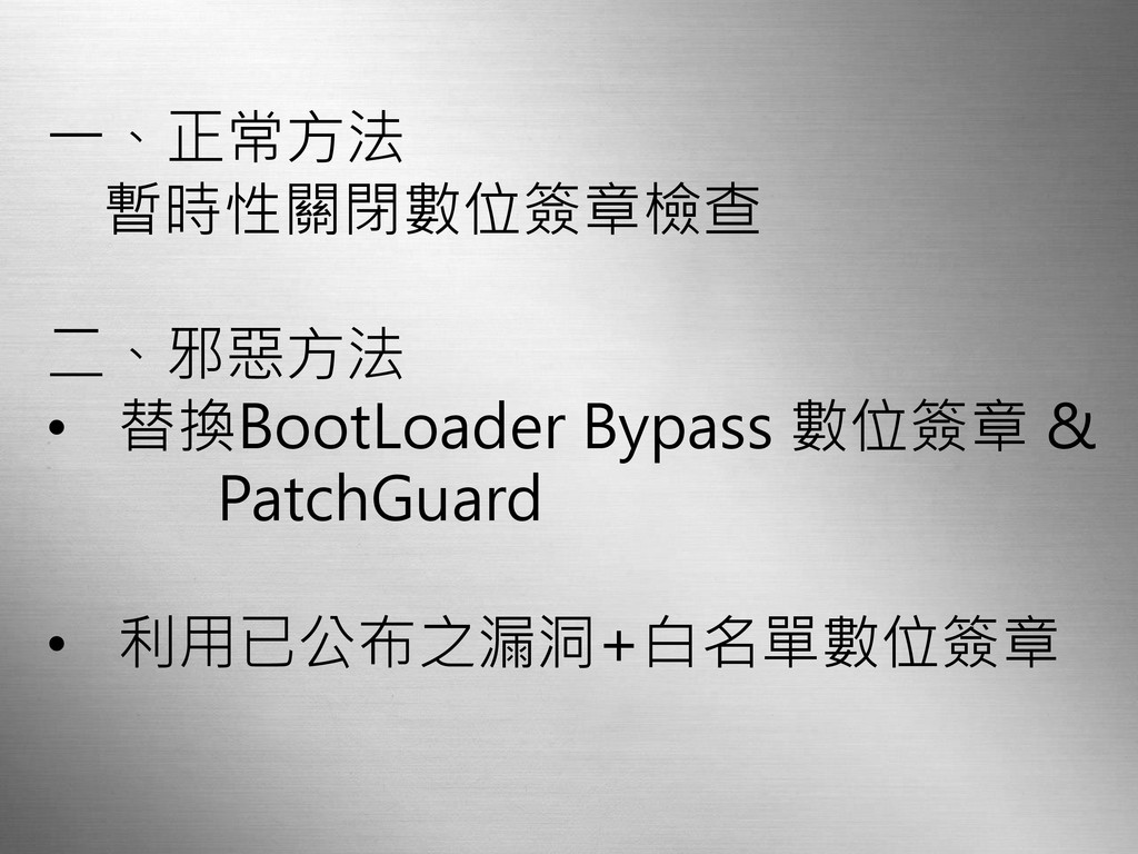 一、正常方法 暫時性關閉數位簽章檢查 二、邪惡方法 • 替換BootLoader Bypass 數位簽章 & PatchGuard •