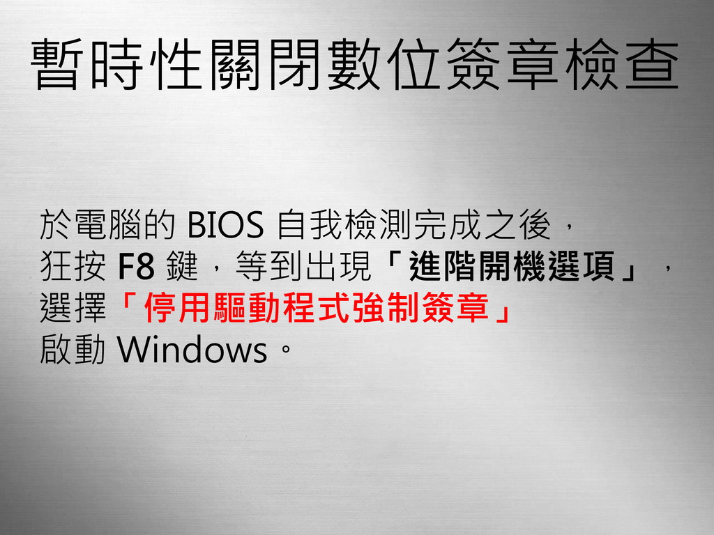 暫時性關閉數位簽章檢查 於電腦的 BIOS 自我檢測完成之後, 狂按 F8 鍵,等到出現「進階開機選項」, 選擇「停用驅動程式強制簽章」 啟動 Windows。