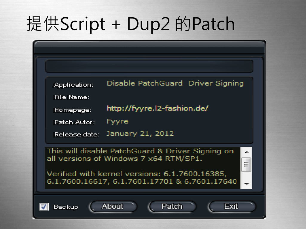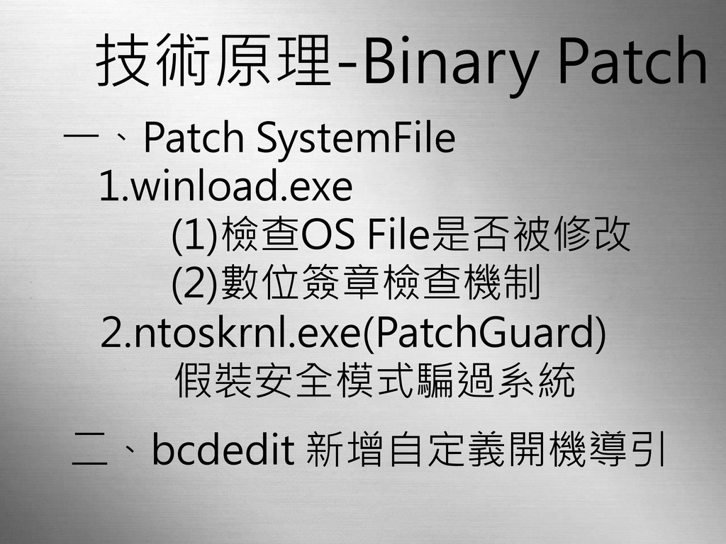 一、Patch SystemFile 1.winload.exe (1)檢查OS File是否被修改 (2)數位簽章檢查機制 技術原理-Binary Patch 2.ntoskrnl.exe(PatchGuard) 假裝安全模式騙過系統
