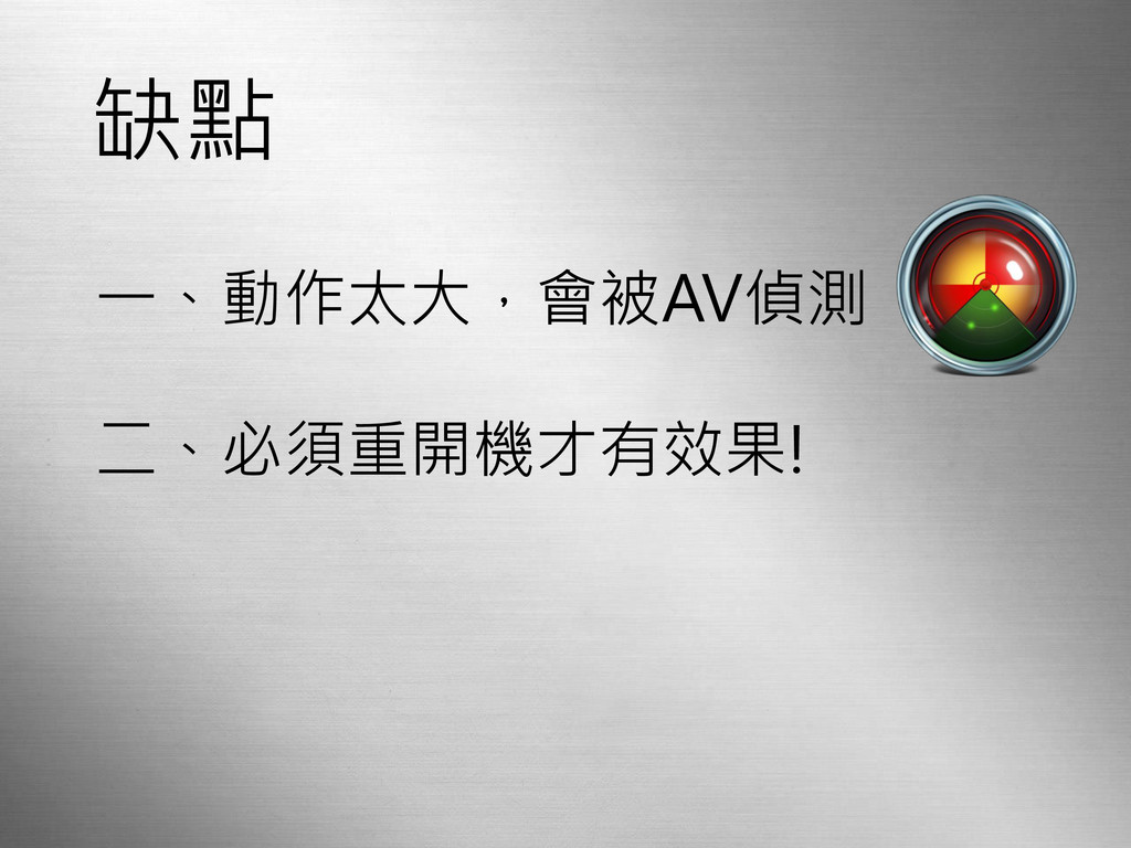 缺點 一、動作太大,會被AV偵測 二、必須重開機才有效果!