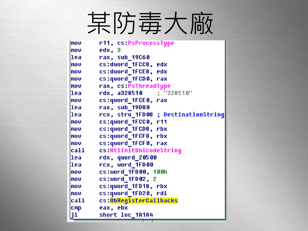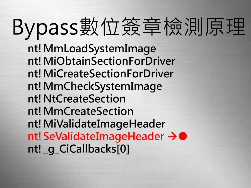 Bypass數位簽章檢測原理 nt!MmLoadSystemImage nt!MiObtainSectionForDriver nt!MiCreateSectionForDriver nt!MmCheckSystemImage nt!NtCreateSection nt!MmCreateSection nt!MiValidateImageHeader nt!SeValidateImageHeader •
