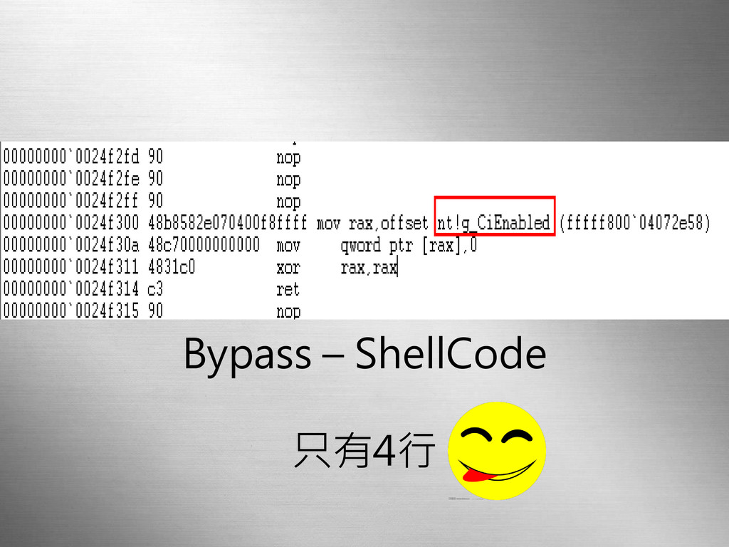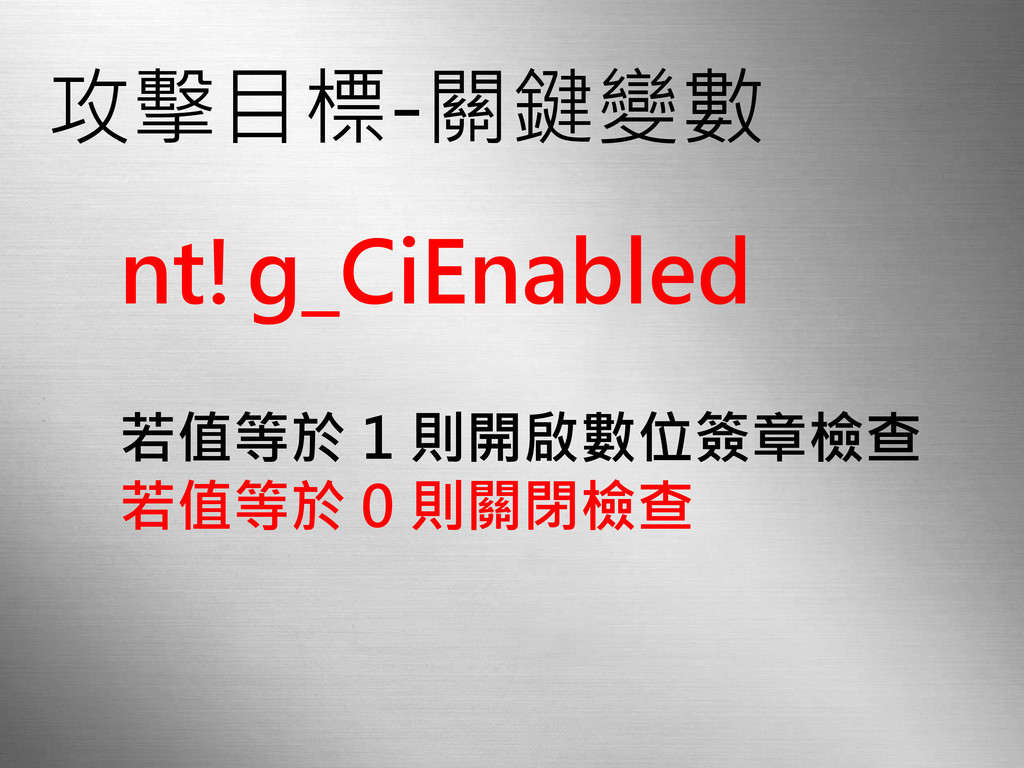攻擊目標-關鍵變數 nt!g_CiEnabled 若值等於 1 則開啟數位簽章檢查 若值等於 0 則關閉檢查