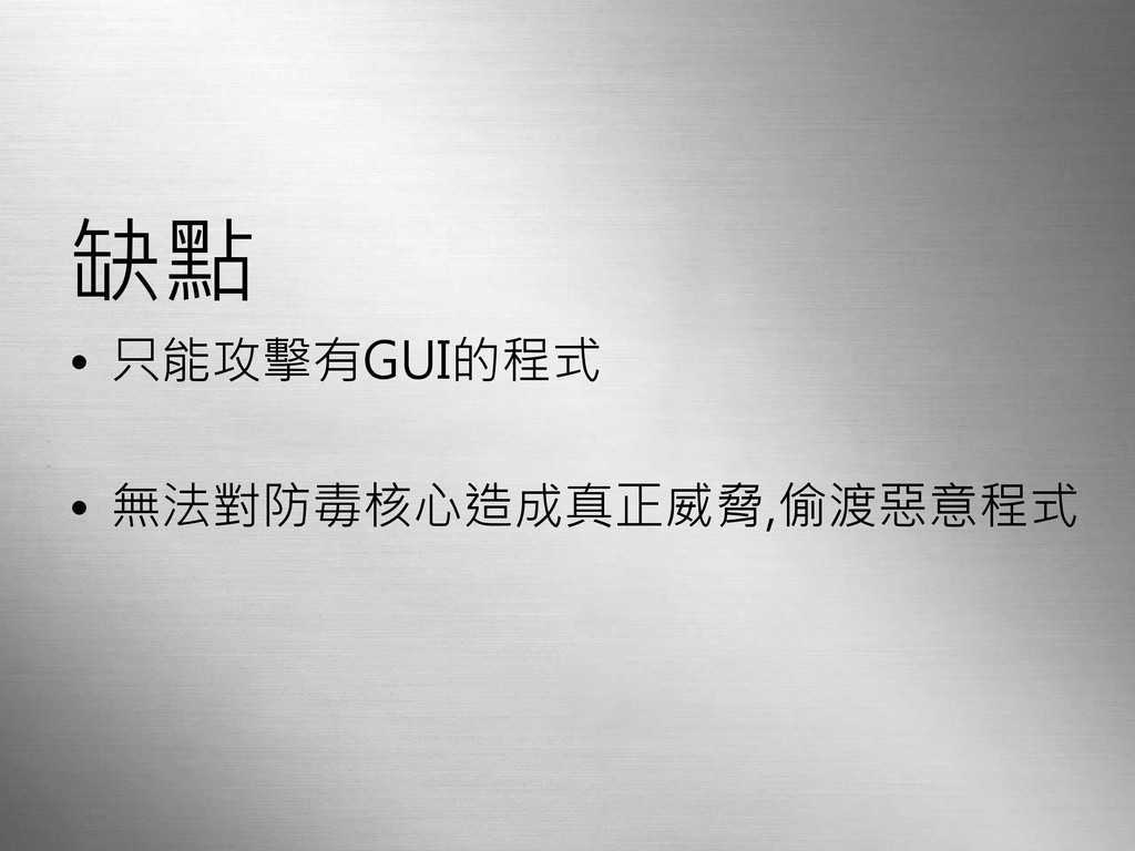 缺點 • 只能攻擊有GUI的程式 • 無法對防毒核心造成真正威脅,偷渡惡意程式