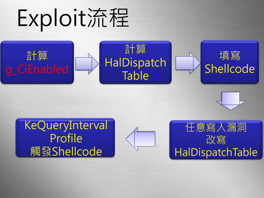 Exploit流程 計算 g_CiEnabled 計算 HalDispatch Table 填寫 Shellcode 任意寫入漏洞 改寫