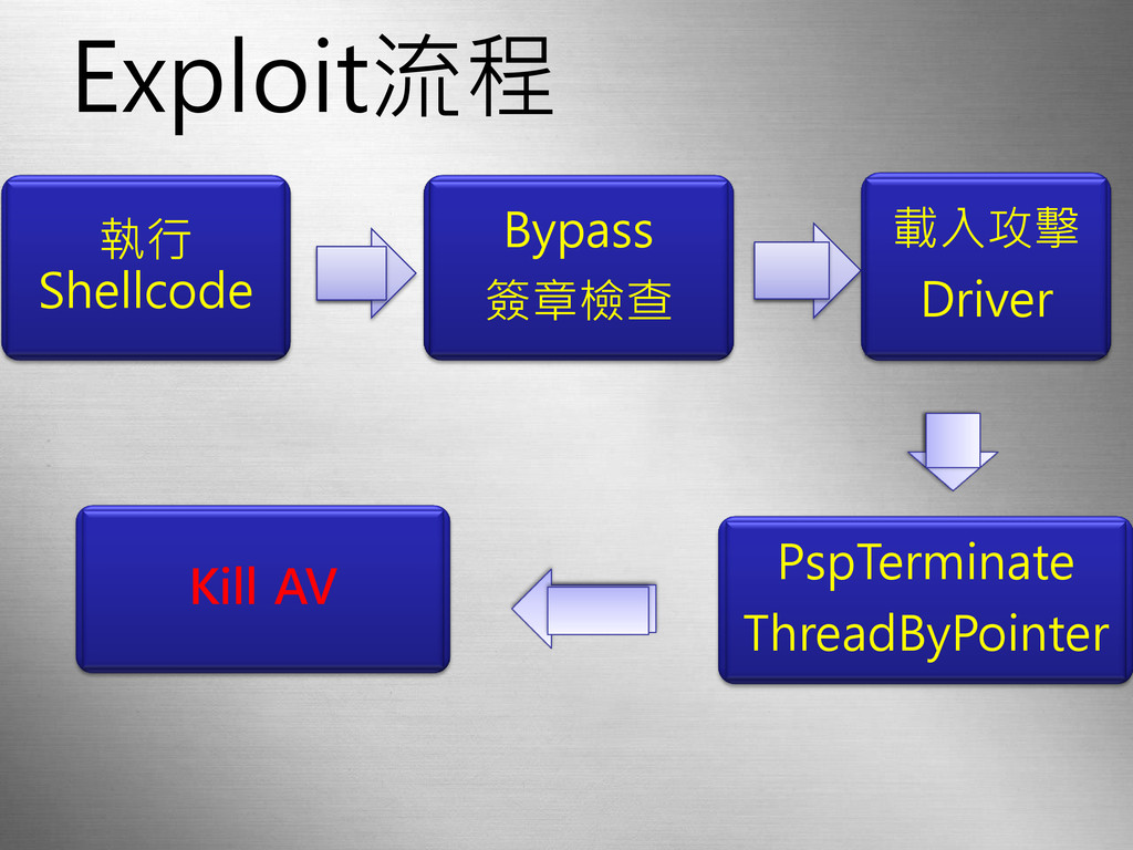 Exploit流程 執行 Shellcode Bypass 簽章檢查 載入攻擊 Driver Kill AV PspTerminate