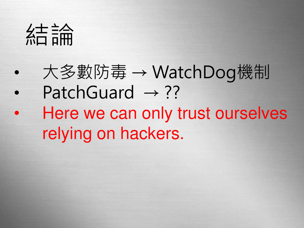 結論 • 大多數防毒 → WatchDog機制 • PatchGuard → ?? •