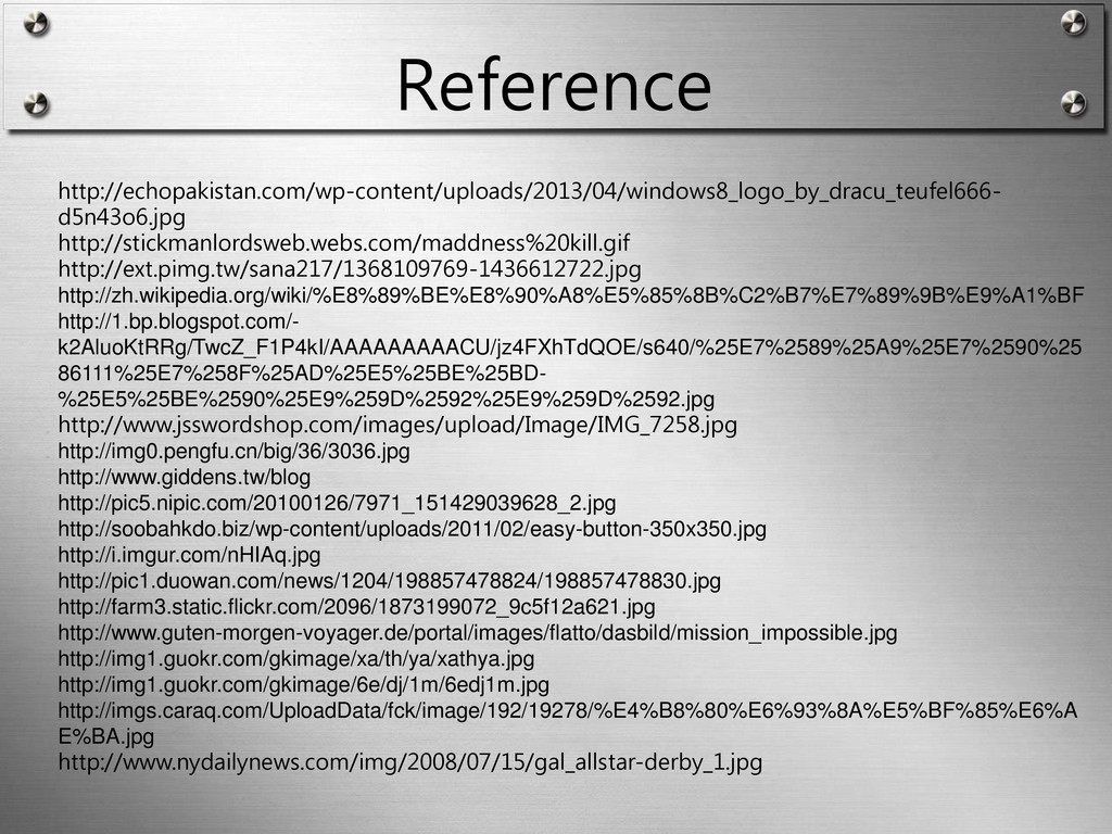Reference http://echopakistan.com/wp-content/uploads/2013/04/windows8_logo_by_dracu_teufel666- d5n43o6.jpg http://stickmanlordsweb.webs.com/maddness%20kill.gif http://ext.pimg.tw/sana217/1368109769-1436612722.jpg http://zh.wikipedia.org/wiki/%E8%89%BE%E8%90%A8%E5%85%8B%C2%B7%E7%89%9B%E9%A1%BF http://1.bp.blogspot.com/- k2AluoKtRRg/TwcZ_F1P4kI/AAAAAAAAACU/jz4FXhTdQOE/s640/%25E7%2589%25A9%25E7%2590%25 86111%25E7%258F%25AD%25E5%25BE%25BD- %25E5%25BE%2590%25E9%259D%2592%25E9%259D%2592.jpg