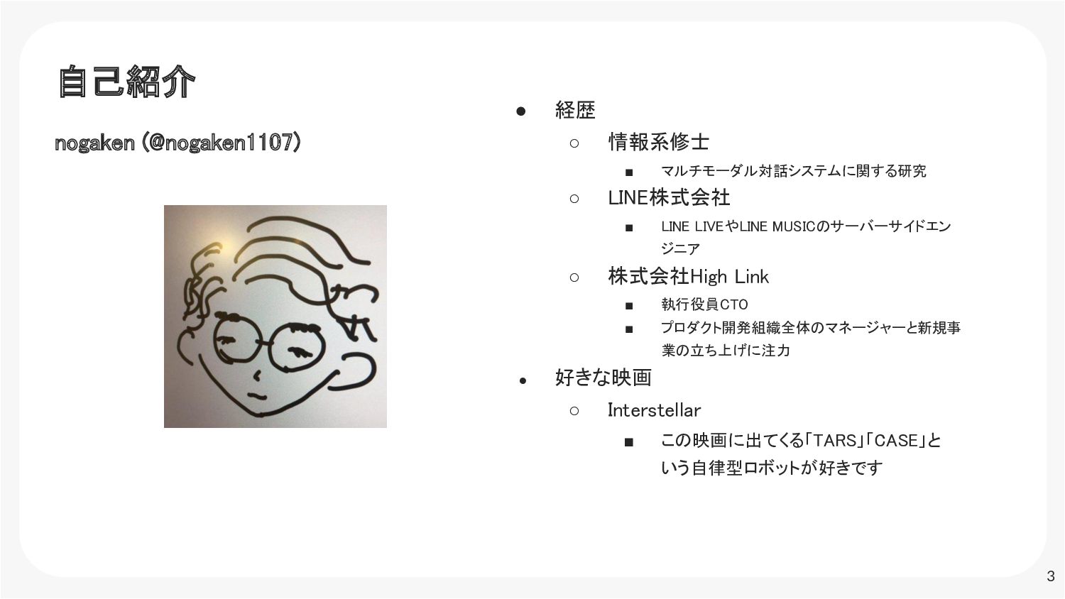 ◦ LINE株式会社 ▪ LINE LIVEやLINE MUSICのサーバーサイドエン ジニア ◦ 株式会社High Link ▪ 執行役員CTO ▪ プロダクト開発組織全体のマネージャーと新規事 業の立ち上げに注力 • 好きな映画 ◦ Interstellar ▪ この映画に出てくる「TARS」「CASE」と いう自律型ロボットが好きです