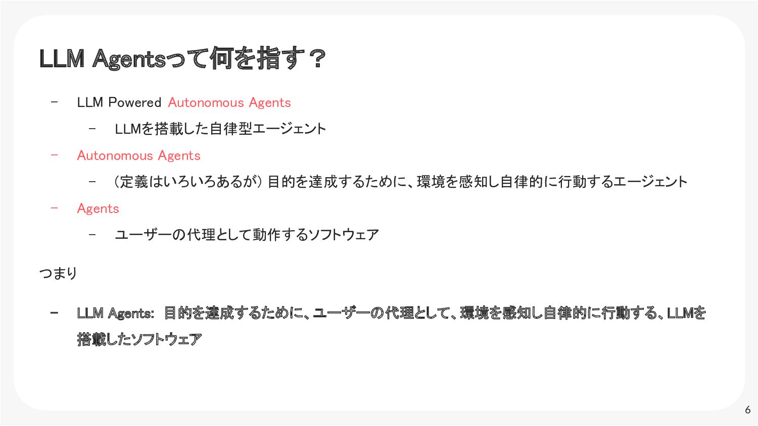 - Autonomous Agents - (定義はいろいろあるが) 目的を達成するために、環境を感知し自律的に行動するエージェント - Agents - ユーザーの代理として動作するソフトウェア つまり - LLM Agents: 目的を達成するために、ユーザーの代理として、環境を感知し自律的に行動する、LLMを 搭載したソフトウェア 6