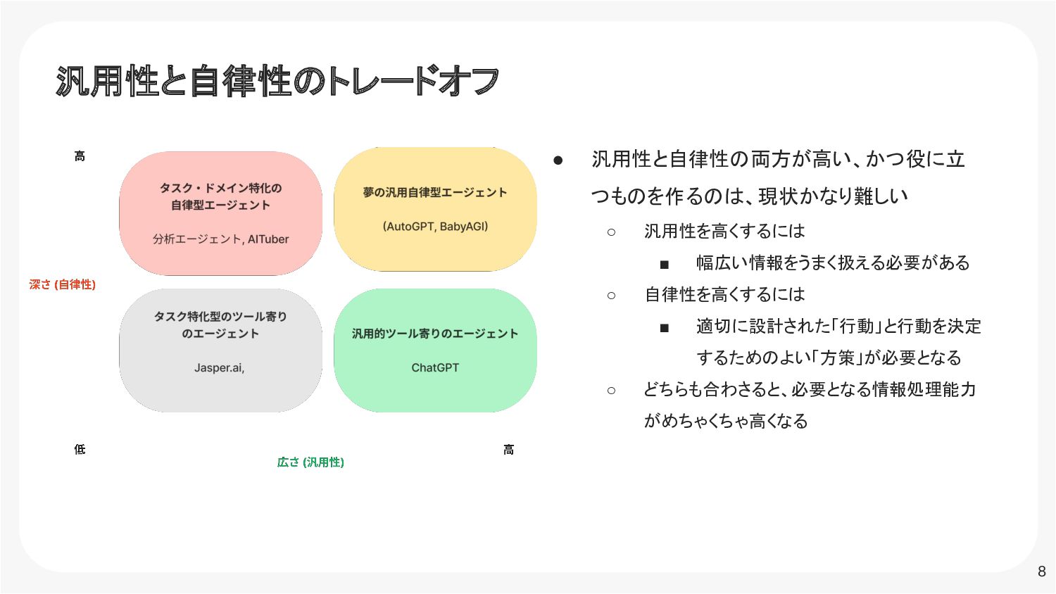 広さ(汎用性)と深さ (自律性)によるエージェントの分類 7 • 汎用性 ◦ 高いほど、広範囲の目的をカバーする • 自律性 ◦