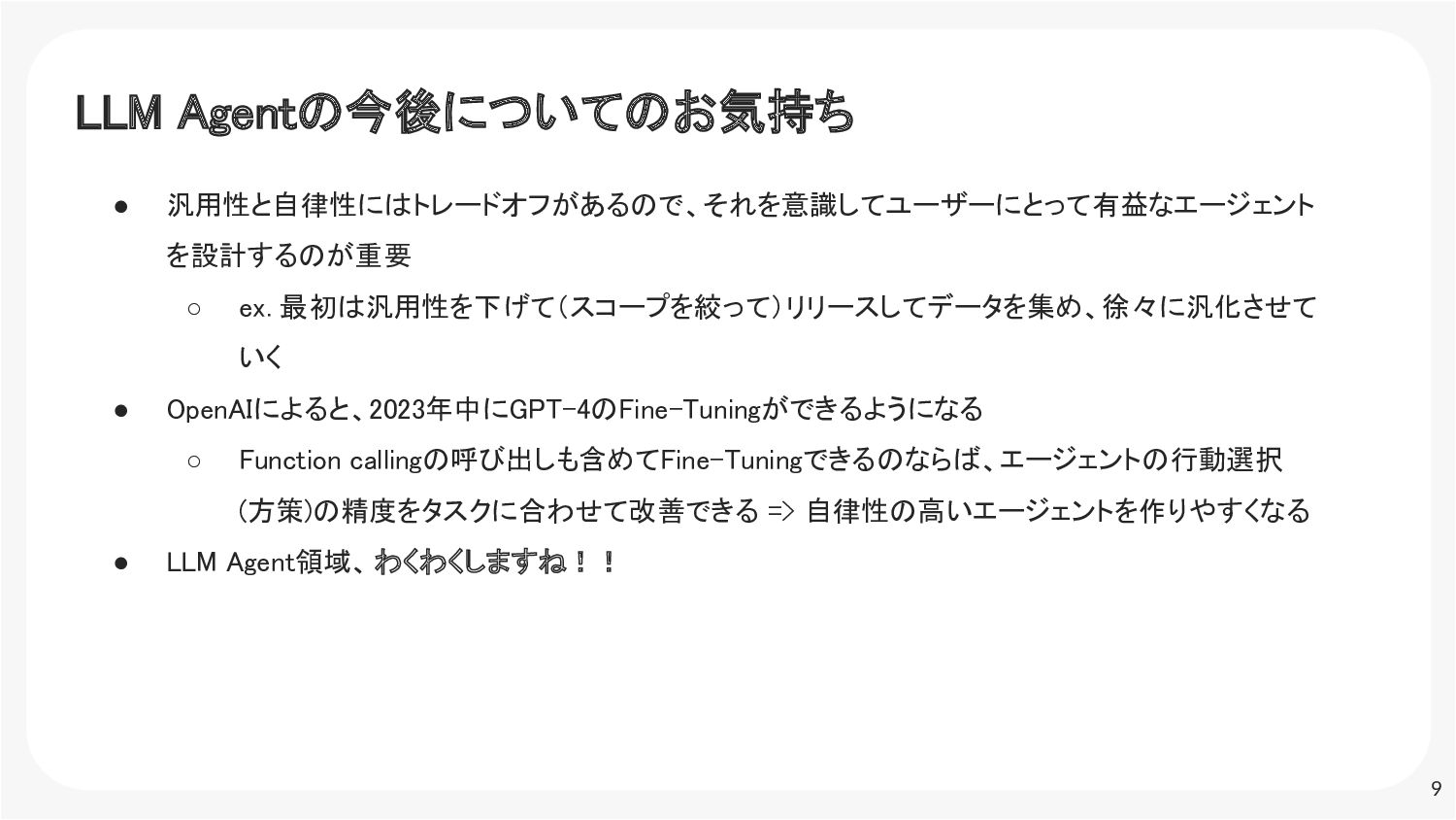 ex. 最初は汎用性を下げて(スコープを絞って)リリースしてデータを集め、徐々に汎化させて いく • OpenAIによると、2023年中にGPT-4のFine-Tuningができるようになる ◦ Function callingの呼び出しも含めてFine-Tuningできるのならば、エージェントの行動選択 (方策)の精度をタスクに合わせて改善できる => 自律性の高いエージェントを作りやすくなる • LLM Agent領域、わくわくしますね!!