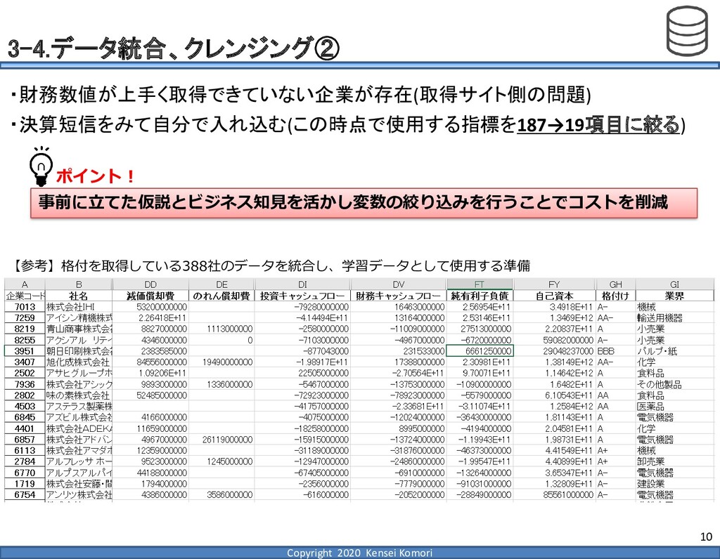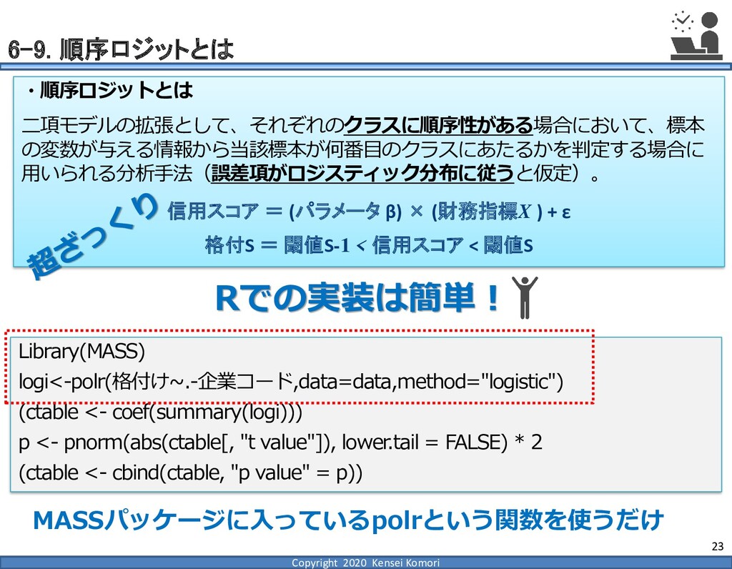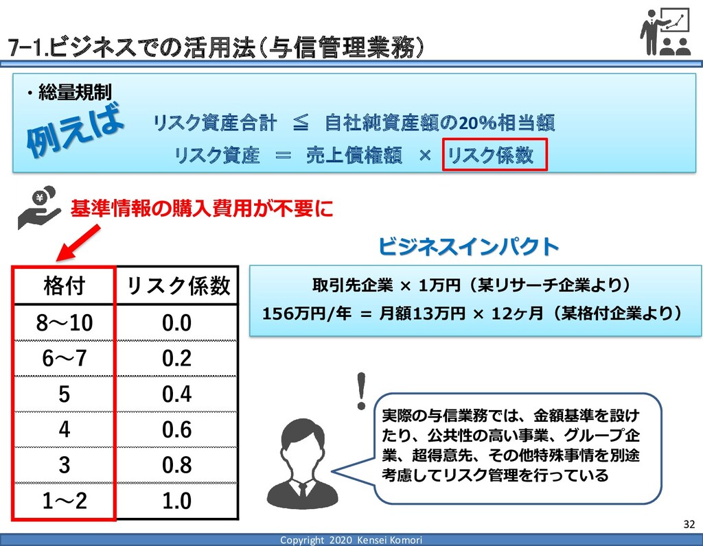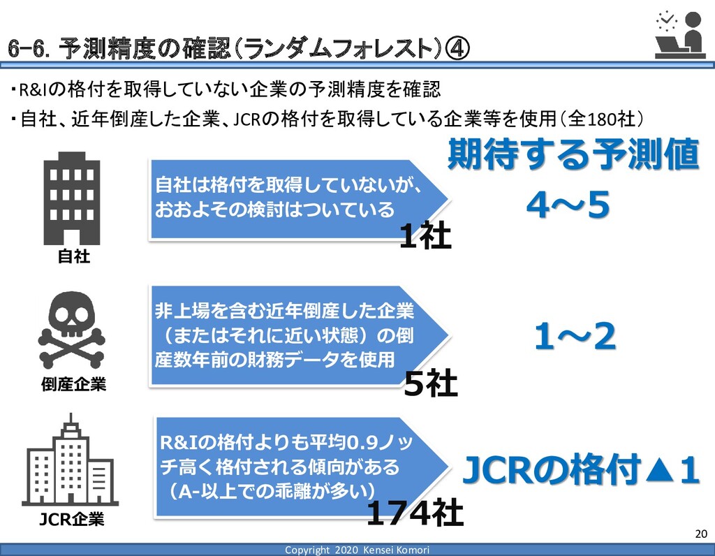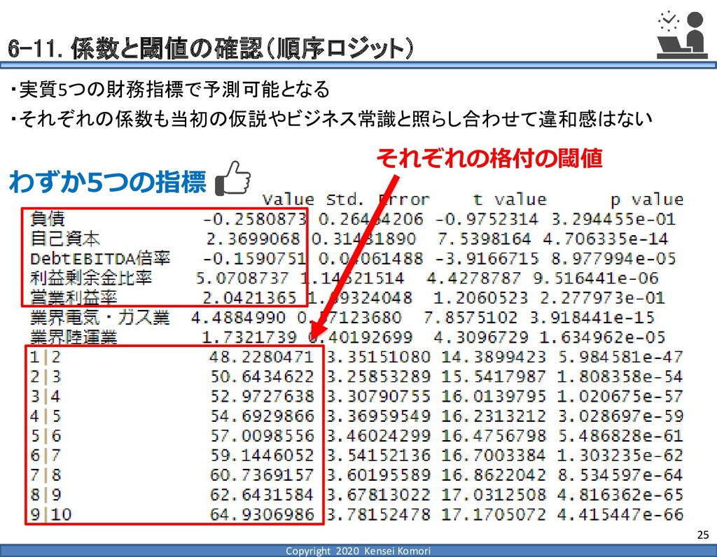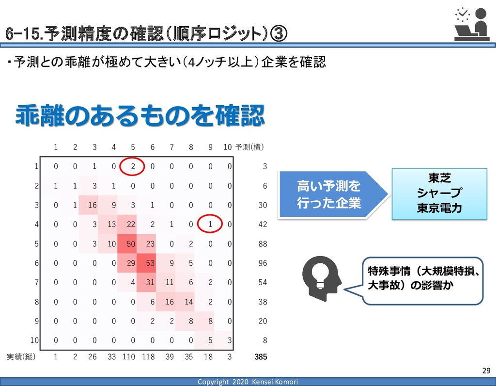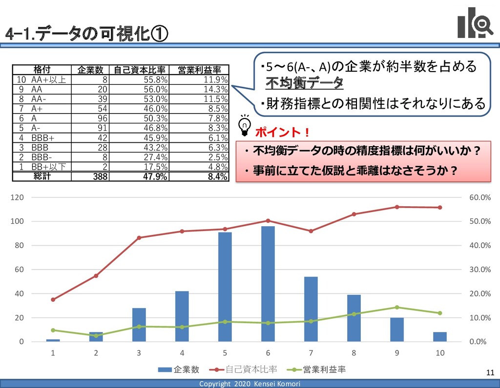 DebtEBITDA倍率 利益剰余金比率 営業利益率 現在 1,000億円 1,000億円 4 25.0% 7.0% 借入 2,000億円 1,000億円 8 16.7% 7.0% 増資 1,000億円 2,000億円 4 16.7% 7.0% EBITDA 250億円 利益剰余金 500億円 順序ロジットに当てはめる prob1 prob2 prob3 prob4 prob5 prob6 prob7 prob8 prob9 prob10 max 現在 0.2% 2.4% 19.0% 39.0% 33.4% 5.3% 0.6% 0.1% 0.0% 0.0% 39.0% 借入 0.8% 7.6% 40.2% 35.5% 14.1% 1.6% 0.2% 0.0% 0.0% 0.0% 40.2% 増資 0.1% 0.7% 6.7% 23.7% 51.0% 15.4% 2.0% 0.4% 0.1% 0.0% 51.0% 現在の格付が4なので、そこは維持したい 全額借入で調達するのはヤメテおこう・・・