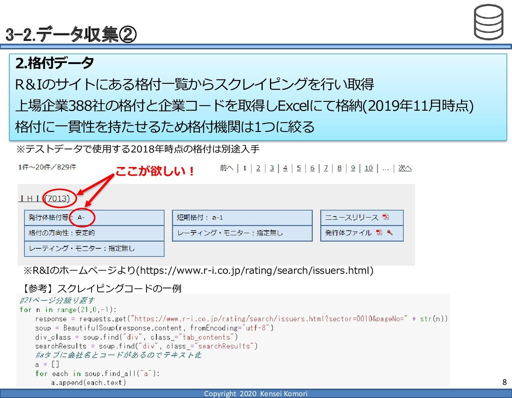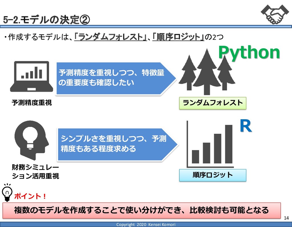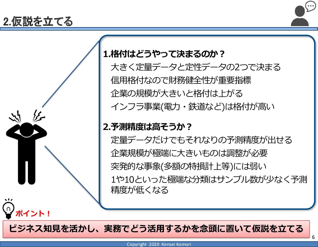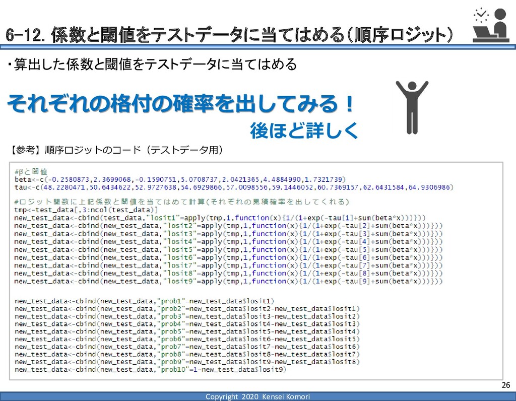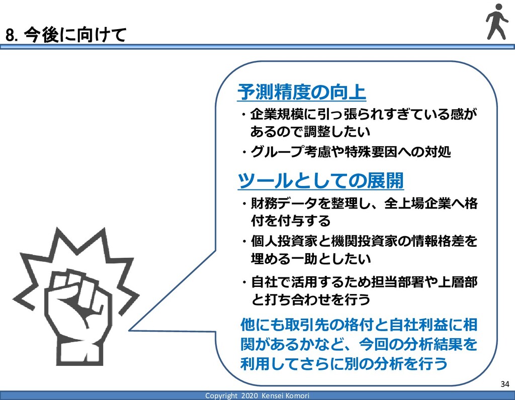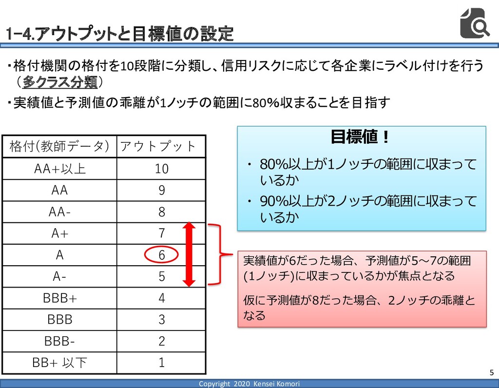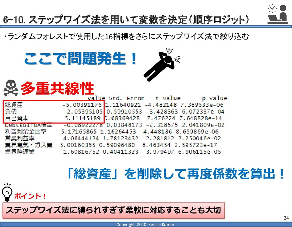 DebtEBITDA倍率 利益剰余金比率 営業利益率 現在 1,000億円 1,000億円 4 25.0% 7.0% 借入 2,000億円 1,000億円 8 16.7% 7.0% 増資 1,000億円 2,000億円 4 16.7% 7.0% EBITDA 250億円 利益剰余金 500億円 順序ロジットに当てはめる prob1 prob2 prob3 prob4 prob5 prob6 prob7 prob8 prob9 prob10 max 現在 0.2% 2.4% 19.0% 39.0% 33.4% 5.3% 0.6% 0.1% 0.0% 0.0% 39.0% 借入 0.8% 7.6% 40.2% 35.5% 14.1% 1.6% 0.2% 0.0% 0.0% 0.0% 40.2% 増資 0.1% 0.7% 6.7% 23.7% 51.0% 15.4% 2.0% 0.4% 0.1% 0.0% 51.0% 現在の格付が4なので、そこは維持したい 全額借入で調達するのはヤメテおこう・・・