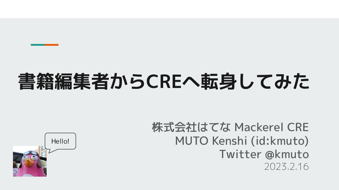 書籍編集者からCREへ転身してみた 株式会社はてな Mackerel CRE MUTO Kenshi (id:kmuto) Twitter @kmuto 2023.2.16