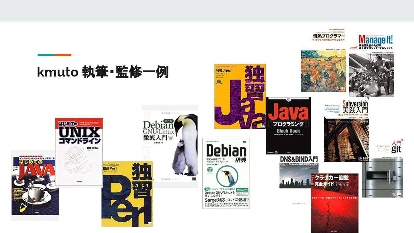 フリーソフトウェア/ オープンソース ソフトウェア開発 • 元 Debian GNU/Linux公式開発者 • 書籍制作系やちょっとした便利ツール の開発