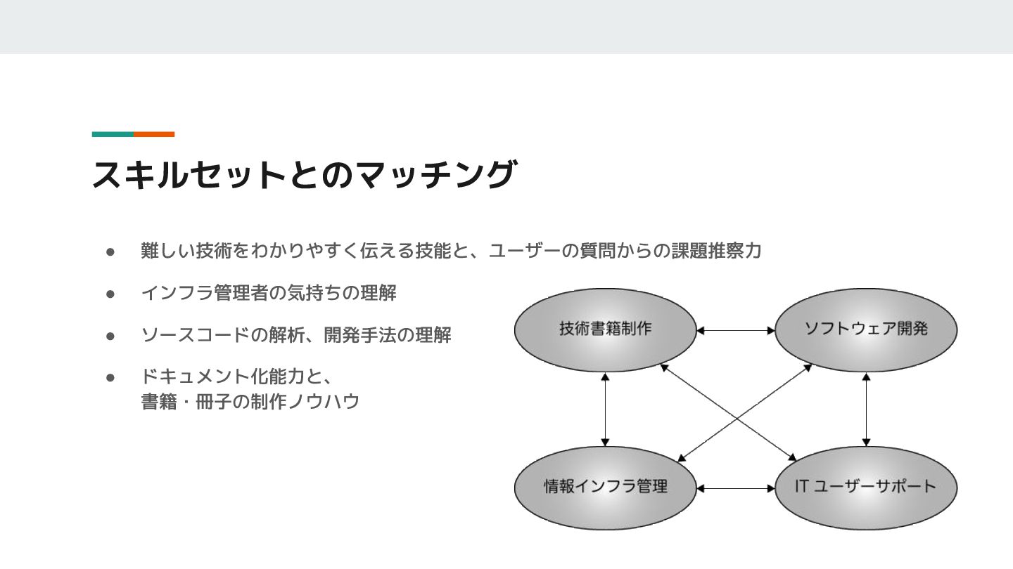 スキルセットとのマッチング • 難しい技術をわかりやすく伝える技能と、ユーザーの質問からの課題推察力 • インフラ管理者の気持ちの理解 • ソースコードの解析、開発手法の理解 • ドキュメント化能力と、 書籍・冊子の制作ノウハウ