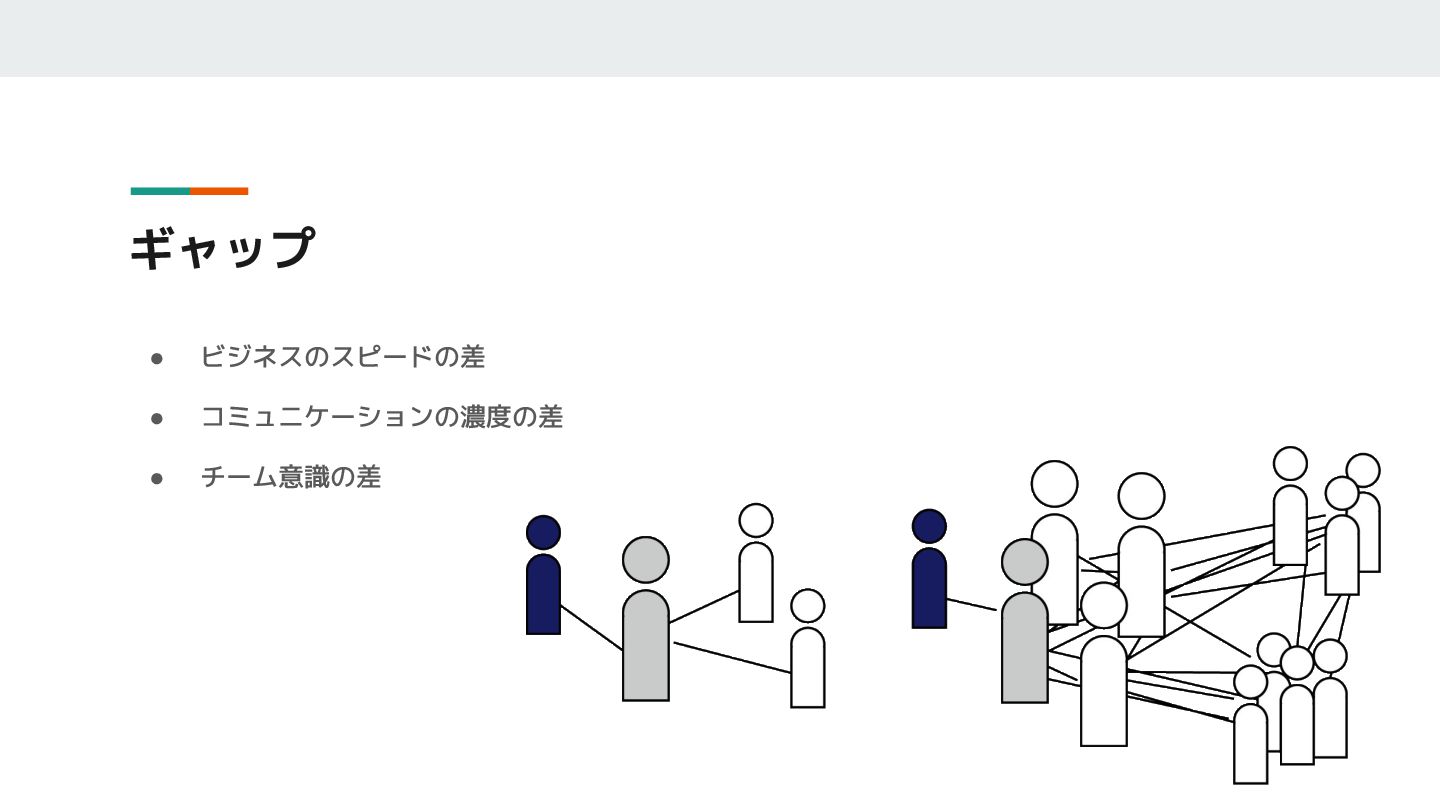 ギャップ • ビジネスのスピードの差 • コミュニケーションの濃度の差 • チーム意識の差