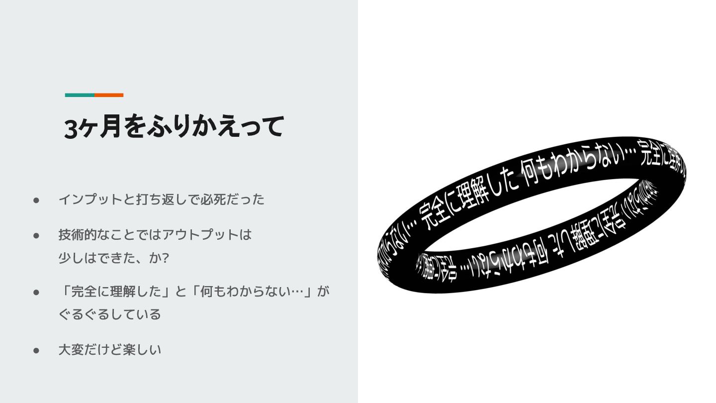 3ヶ月をふりかえって • インプットと打ち返しで必死だった • 技術的なことではアウトプットは 少しはできた、か? • 「完全に理解した」と「何もわからない…」が ぐるぐるしている •