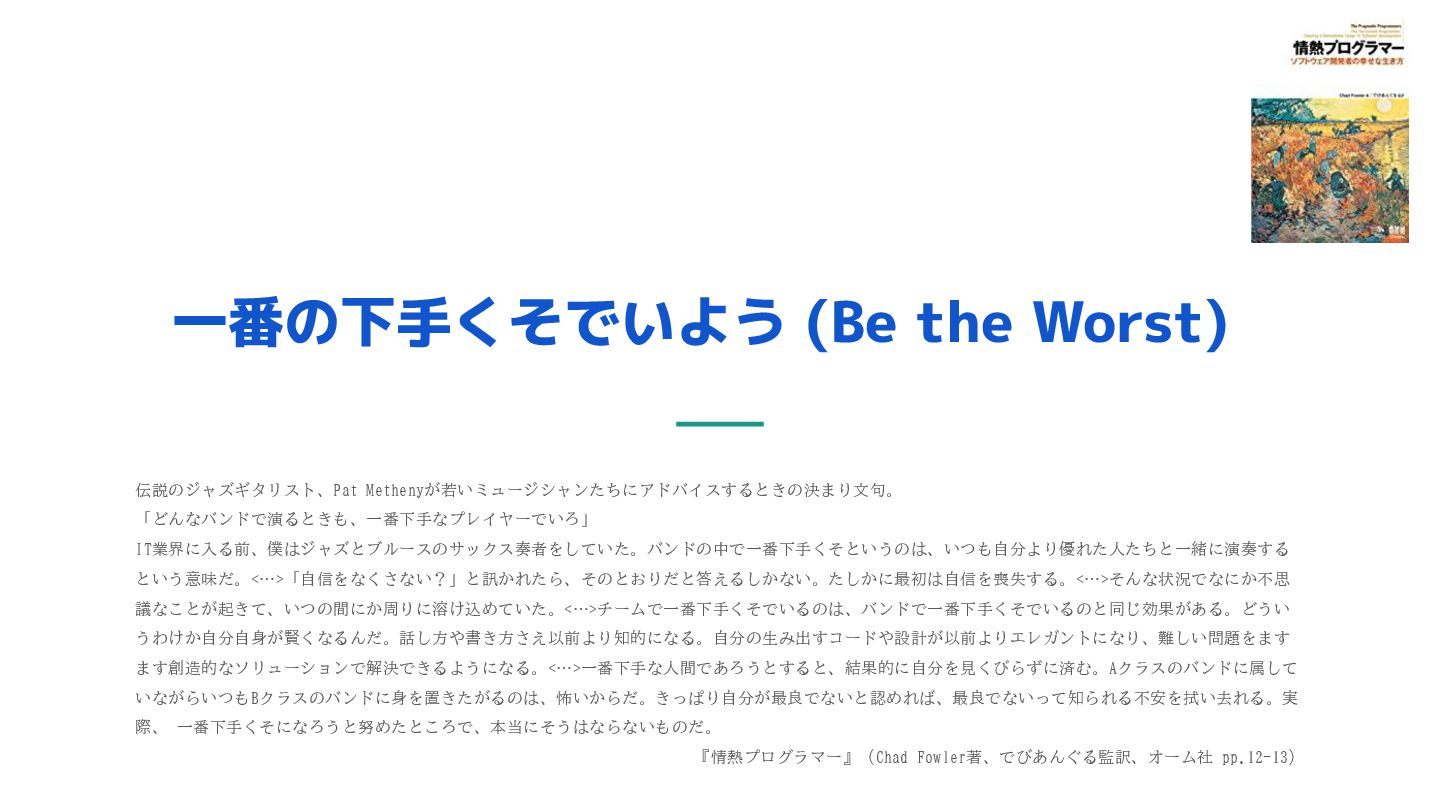一番の下手くそでいよう (Be the Worst) 伝説のジャズギタリスト、Pat Methenyが若いミュージシャンたちにアドバイスするときの決まり文句。 「どんなバンドで演るときも、一番下手なプレイヤーでいろ」 IT業界に入る前、僕はジャズとブルースのサックス奏者をしていた。バンドの中で一番下手くそというのは、いつも自分より優れた人たちと一緒に演奏する という意味だ。<…>「自信をなくさない?」と訊かれたら、そのとおりだと答えるしかない。たしかに最初は自信を喪失する。<…>そんな状況でなにか不思 議なことが起きて、いつの間にか周りに溶け込めていた。<…>チームで一番下手くそでいるのは、バンドで一番下手くそでいるのと同じ効果がある。どうい