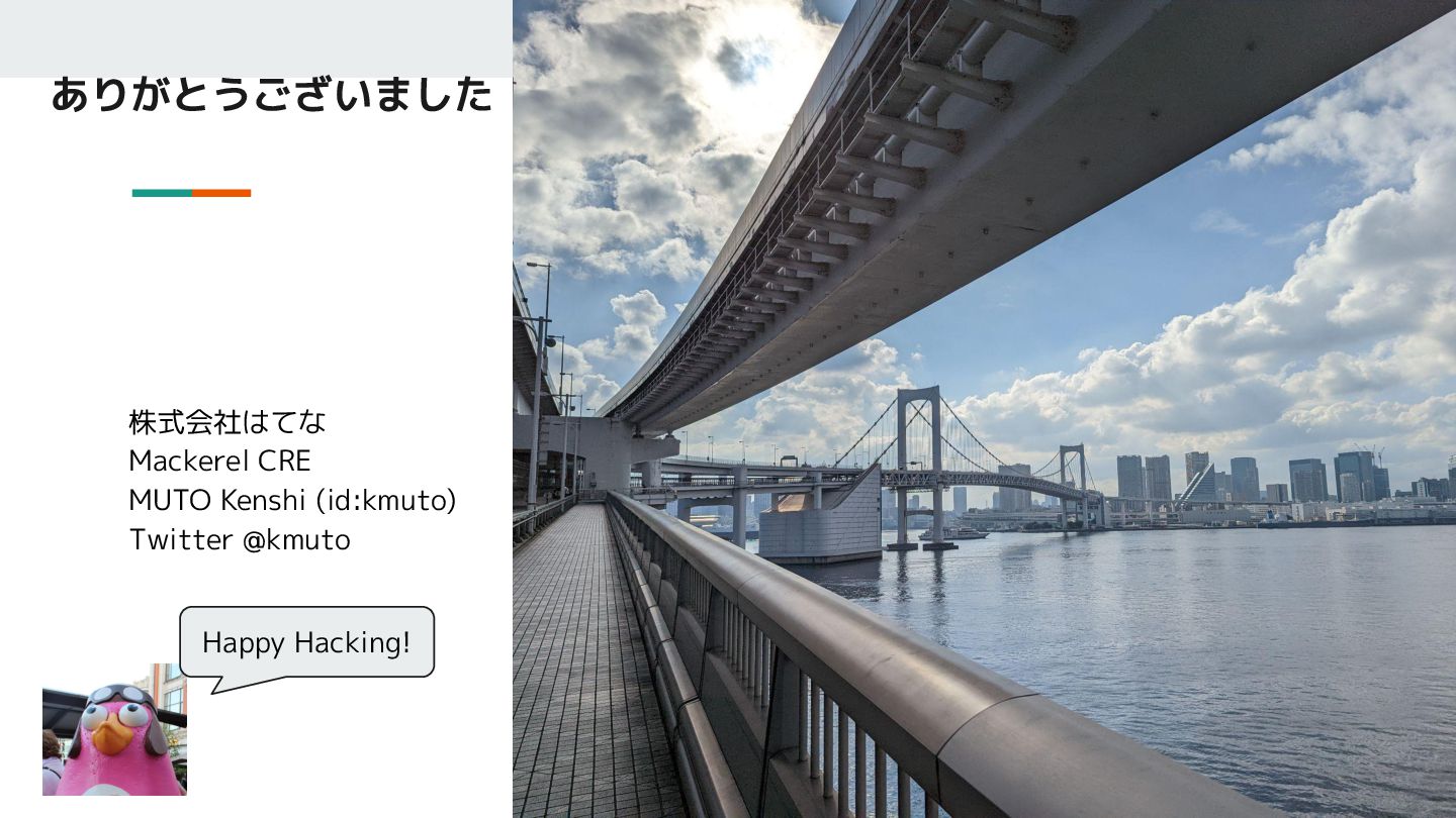 ありがとうございました 株式会社はてな Mackerel CRE MUTO Kenshi (id:kmuto) Twitter @kmuto Happy