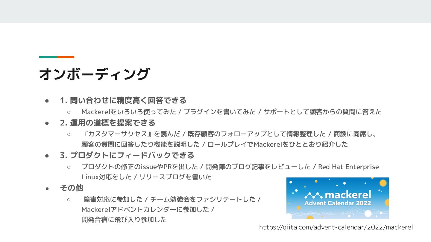 • 2. 運用の道標を提案できる ◦ 『カスタマーサクセス』を読んだ / 既存顧客のフォローアップとして情報整理した / 商談に同席し、 顧客の質問に回答したり機能を説明した / ロールプレイでMackerelをひととおり紹介した • 3. プロダクトにフィードバックできる ◦ プロダクトの修正のissueやPRを出した / 開発陣のブログ記事をレビューした / Red Hat Enterprise Linux対応をした / リリースブログを書いた • その他 ◦ 障害対応に参加した / チーム勉強会をファシリテートした / Mackerelアドベントカレンダーに参加した / 開発合宿に飛び入り参加した https://qiita.com/advent-calendar/2022/mackerel
