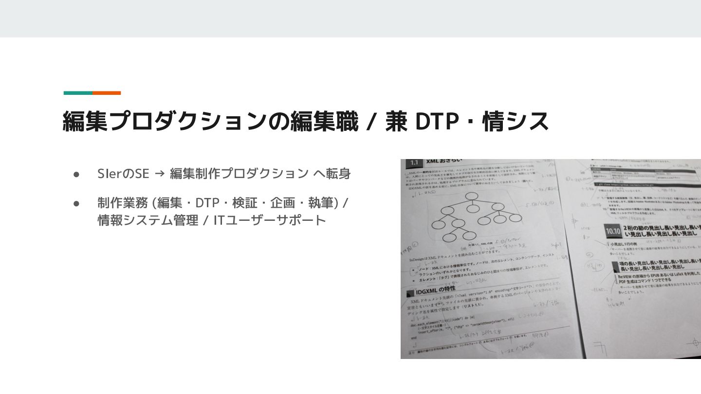 編集プロダクションの編集職 / 兼 DTP・情シス • SIerのSE → 編集制作プロダクション へ転身 •
