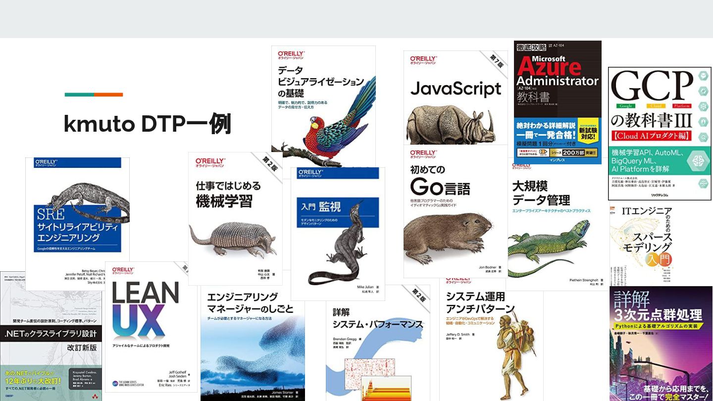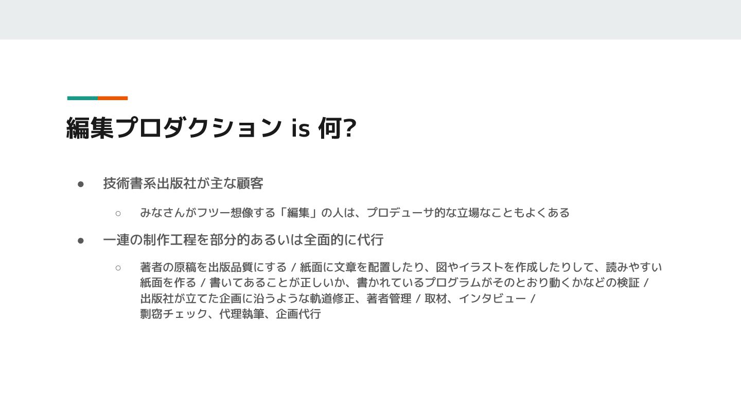 編集プロダクション is 何? • 技術書系出版社が主な顧客 ◦ みなさんがフツー想像する「編集」の人は、プロデューサ的な立場なこともよくある • 一連の制作工程を部分的あるいは全面的に代行 ◦