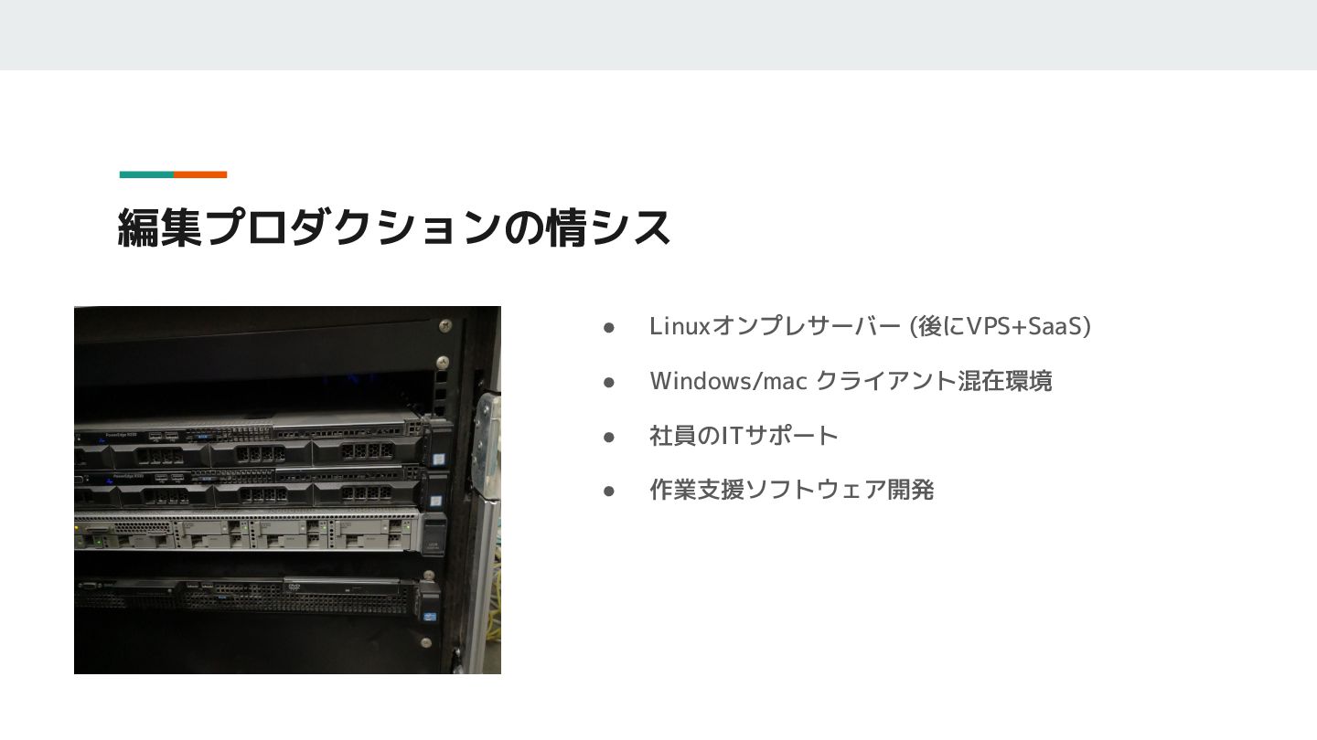 編集プロダクションの情シス • Linuxオンプレサーバー (後にVPS+SaaS) • Windows/mac クライアント混在環境 • 社員のITサポート •