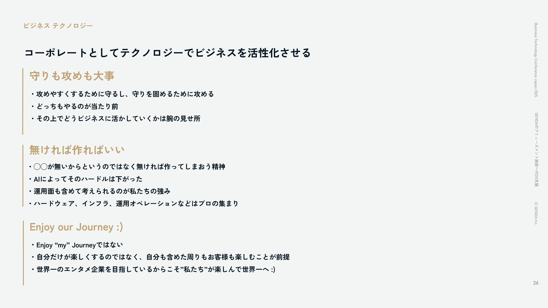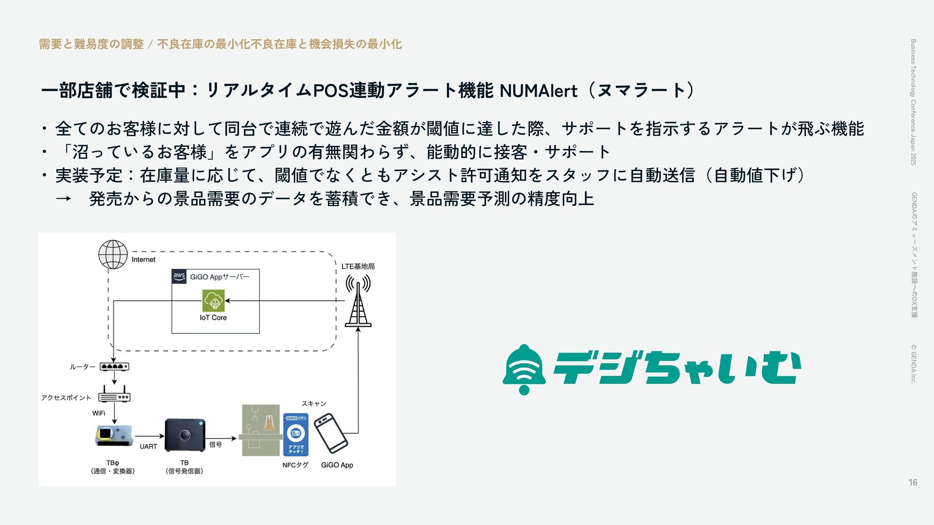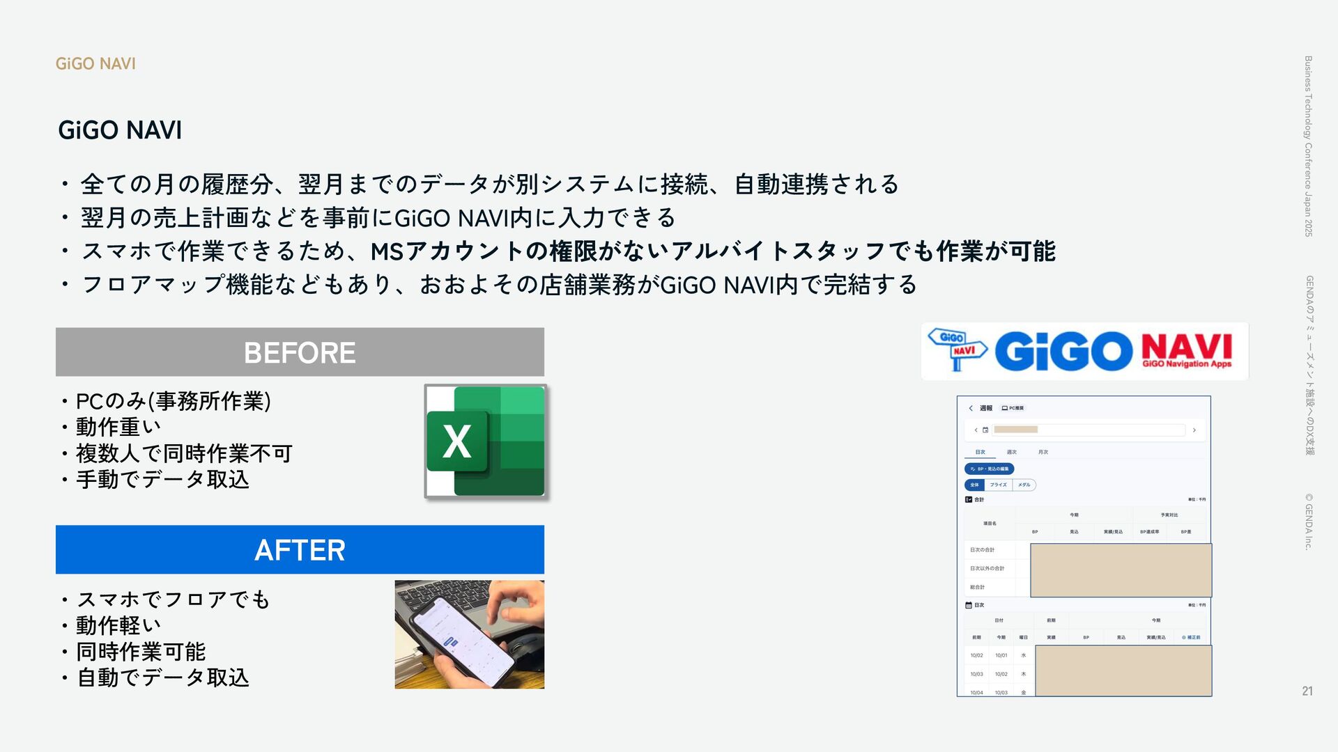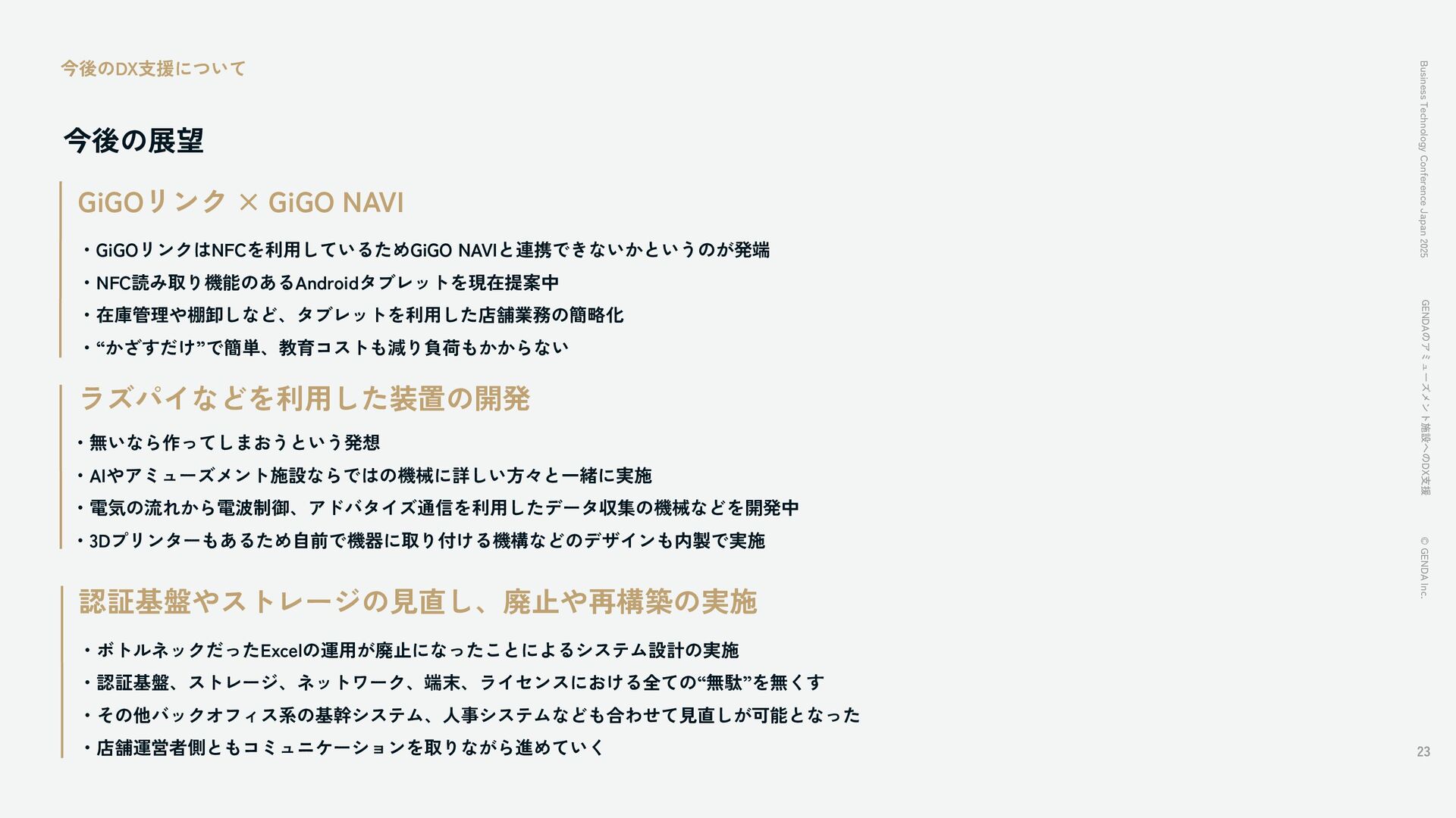 今後のDX支援について 今後の展望 GiGOリンク × GiGO NAVI ラズパイなどを利用した装置の開発 認証基盤やストレージの見直し、廃止や再構築の実施 ・GiGOリンクはNFCを利用しているためGiGO NAVIと連携できないかというのが発端 ・NFC読み取り機能のあるAndroidタブレットを現在提案中 ・在庫管理や棚卸しなど、タブレットを利用した店舗業務の簡略化 ・“かざすだけ”で簡単、教育コストも減り負荷もかからない ・無いなら作ってしまおうという発想 ・AIやアミューズメント施設ならではの機械に詳しい方々と一緒に実施 ・電気の流れから電波制御、アドバタイズ通信を利用したデータ収集の機械などを開発中 ・3Dプリンターもあるため自前で機器に取り付ける機構などのデザインも内製で実施 ・ボトルネックだったExcelの運用が廃止になったことによるシステム設計の実施 ・認証基盤、ストレージ、ネットワーク、端末、ライセンスにおける全ての“無駄”を無くす ・その他バックオフィス系の基幹システム、人事システムなども合わせて見直しが可能となった ・店舗運営者側ともコミュニケーションを取りながら進めていく