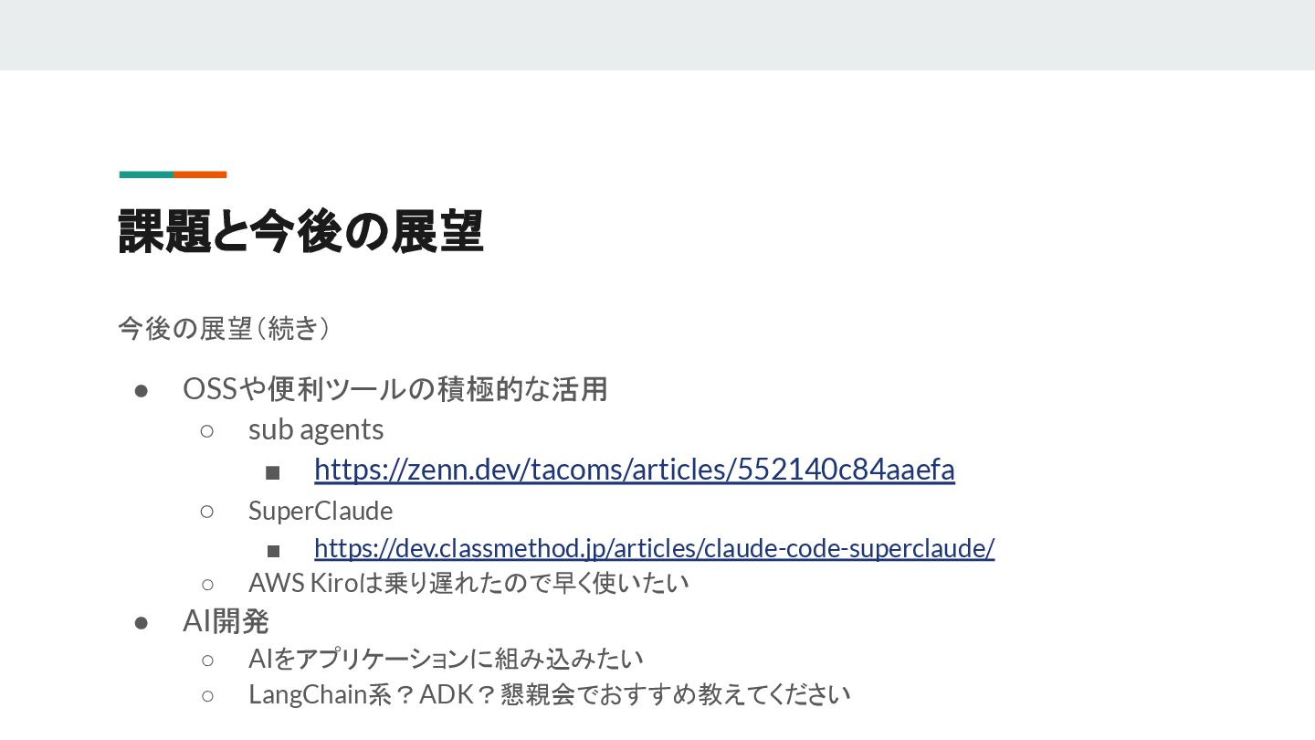 ▪ https://dev.classmethod.jp/articles/claude-code-superclaude/ ◦ AWS Kiroは乗り遅れたので早く使いたい • AI開発 ◦ AIをアプリケーションに組み込みたい ◦ LangChain系?ADK?懇親会でおすすめ教えてください 課題と今後の展望