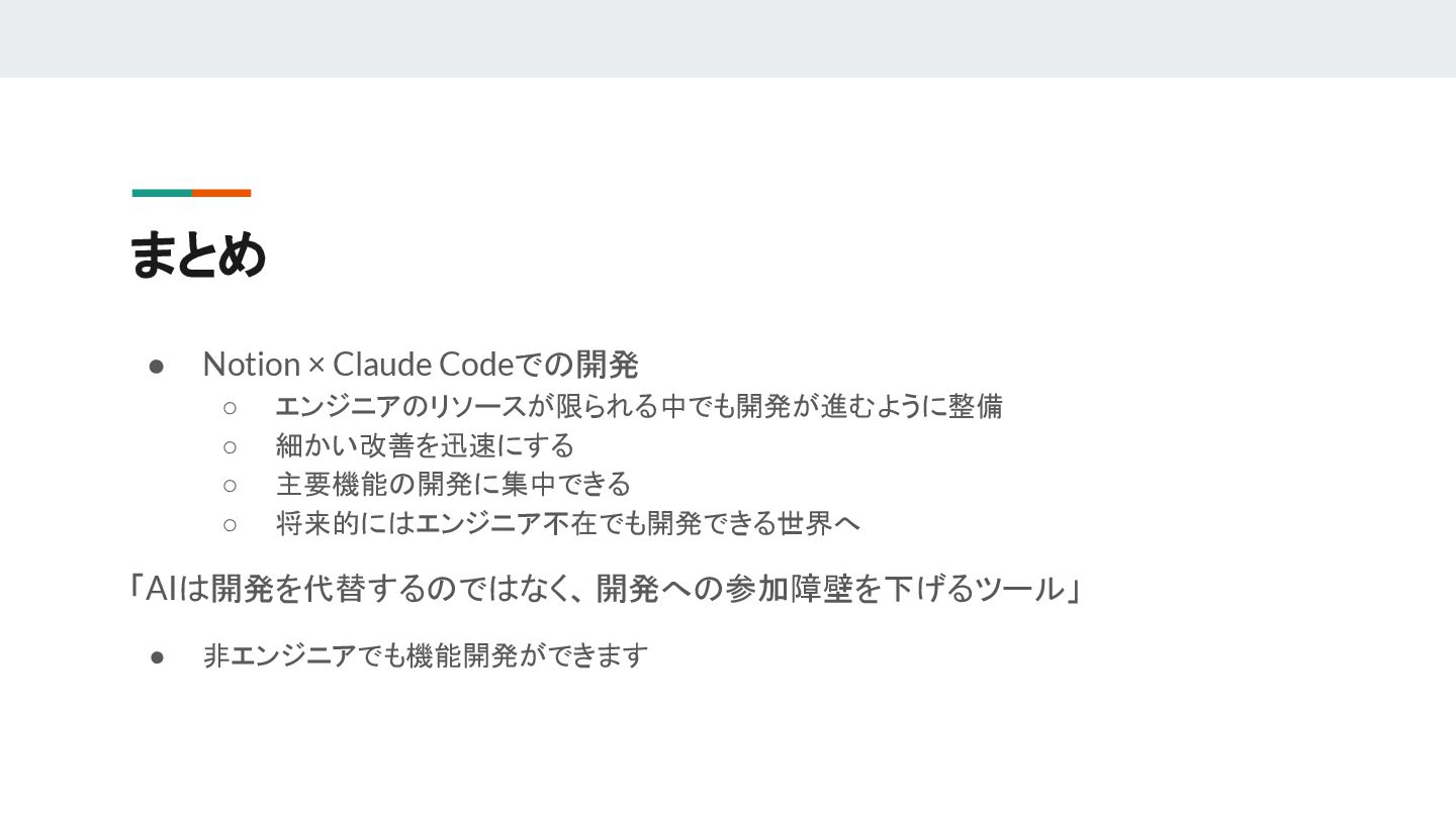 まとめ • Notion × Claude Codeでの開発 ◦ エンジニアのリソースが限られる中でも開発が進むように整備 ◦ 細かい改善を迅速にする