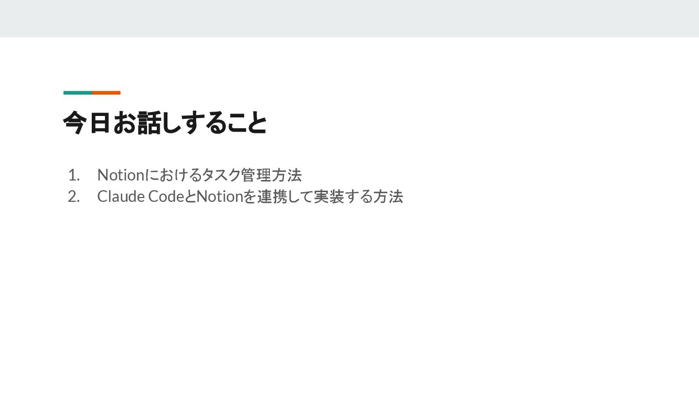 今日お話しすること 1. Notionにおけるタスク管理方法 2. Claude CodeとNotionを連携して実装する方法