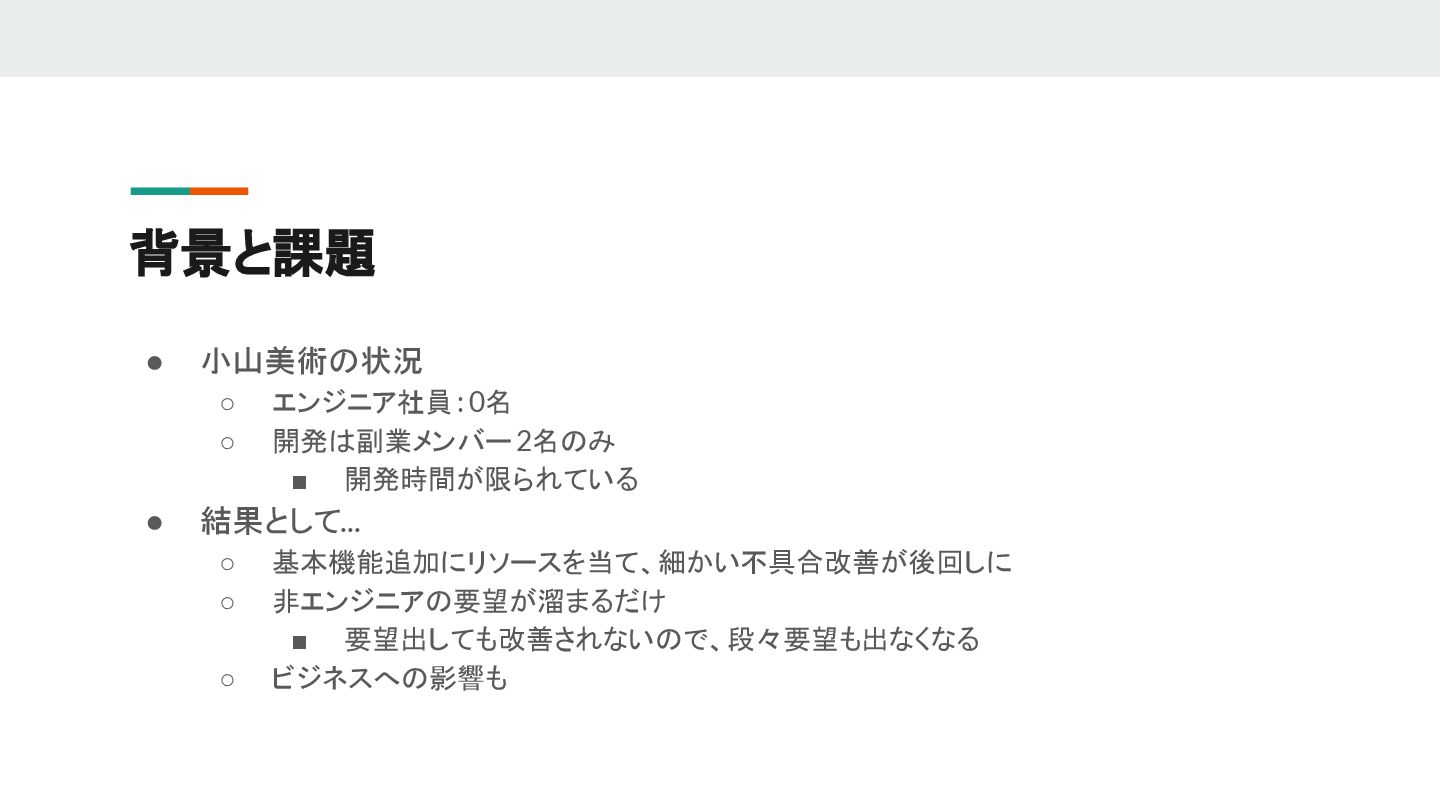 • 小山美術の状況 ◦ エンジニア社員: 0名 ◦ 開発は副業メンバー 2名のみ ▪ 開発時間が限られている