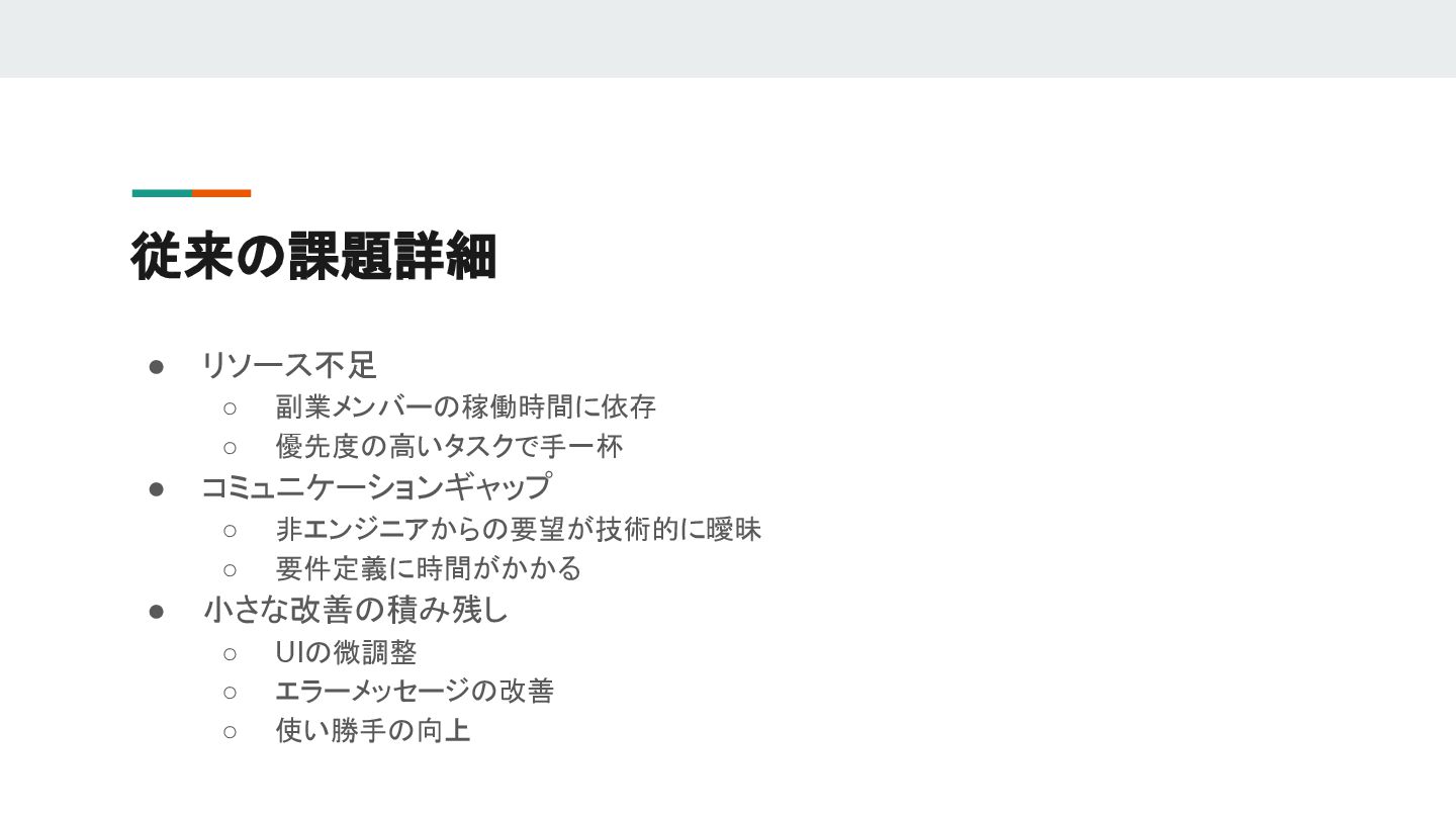非エンジニアからの要望が技術的に曖昧 ◦ 要件定義に時間がかかる • 小さな改善の積み残し ◦ UIの微調整 ◦ エラーメッセージの改善 ◦ 使い勝手の向上