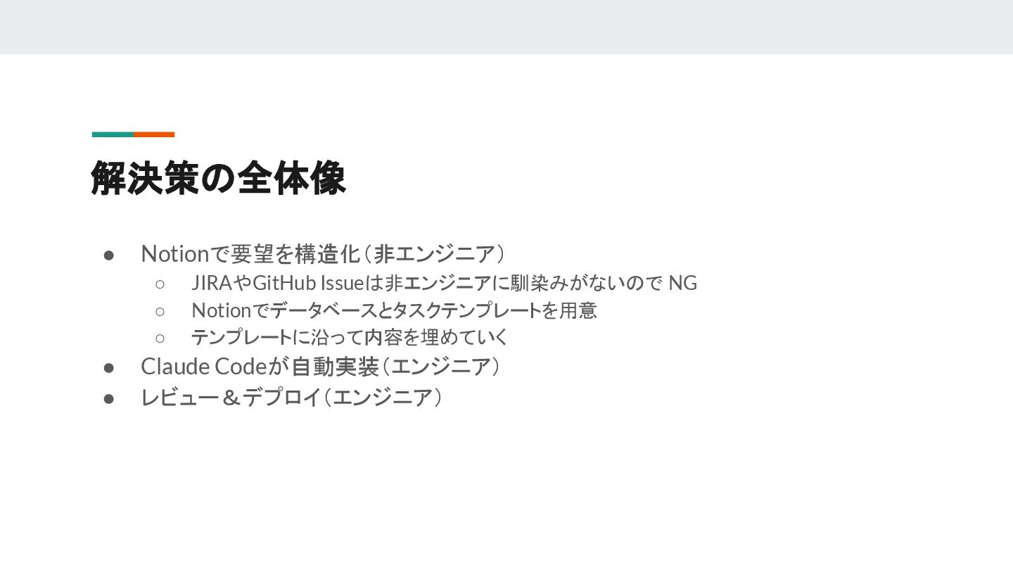 テンプレートに沿って内容を埋めていく • Claude Codeが自動実装(エンジニア) • レビュー&デプロイ(エンジニア)