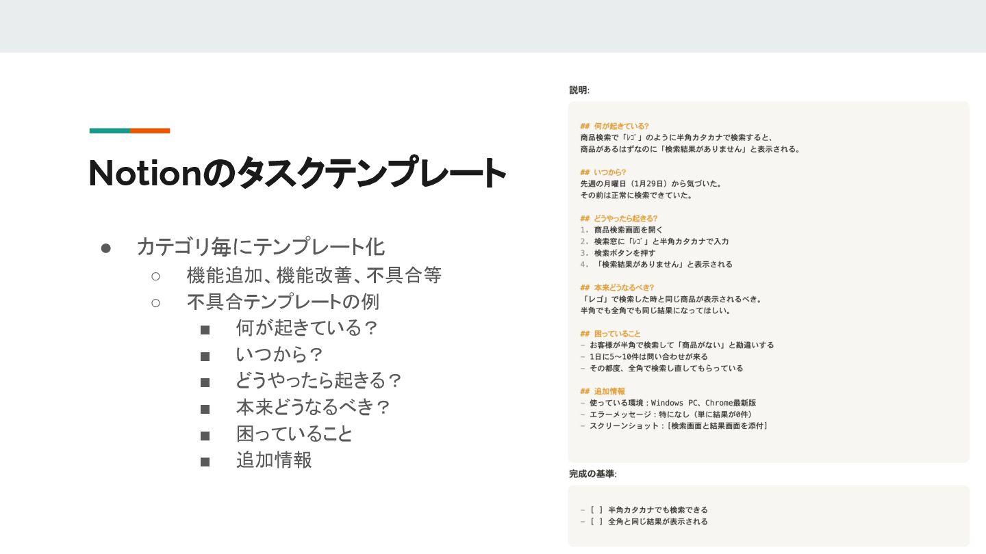 Notionのタスクテンプレート • カテゴリ毎にテンプレート化 ◦ 機能追加、機能改善、不具合等 ◦ 不具合テンプレートの例 ▪ 何が起きている? ▪