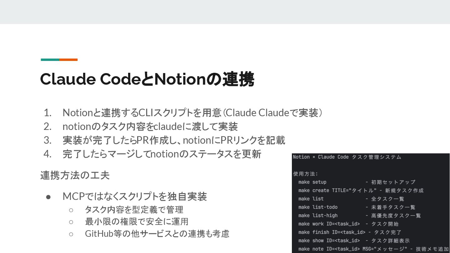 • MCPではなくスクリプトを独自実装 ◦ タスク内容を型定義で管理 ◦ 最小限の権限で安全に運用 ◦ GitHub等の他サービスとの連携も考慮 Claude CodeとNotionの連携