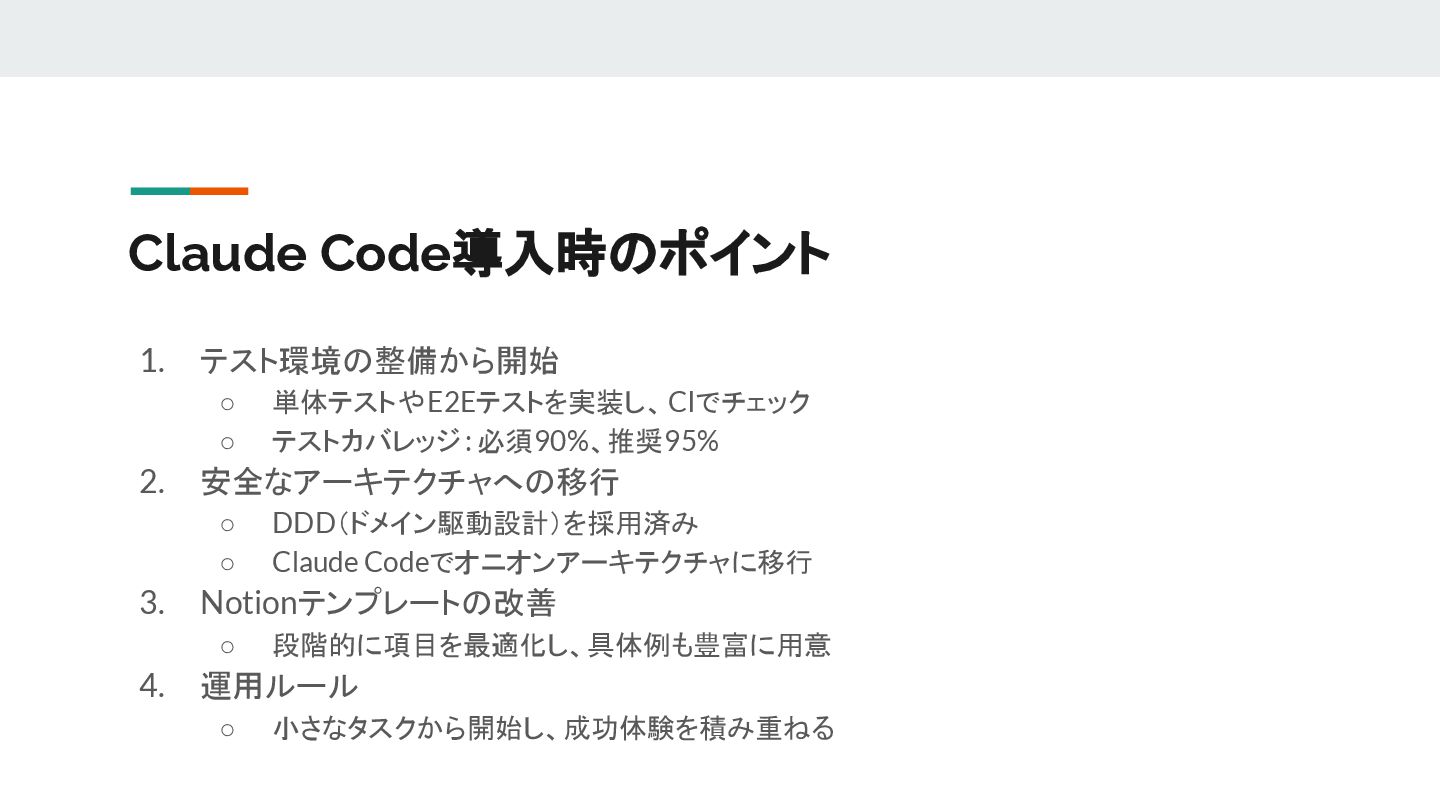 安全なアーキテクチャへの移行 ◦ DDD(ドメイン駆動設計)を採用済み ◦ Claude Codeでオニオンアーキテクチャに移行 3. Notionテンプレートの改善 ◦ 段階的に項目を最適化し、具体例も豊富に用意 4. 運用ルール ◦ 小さなタスクから開始し、成功体験を積み重ねる