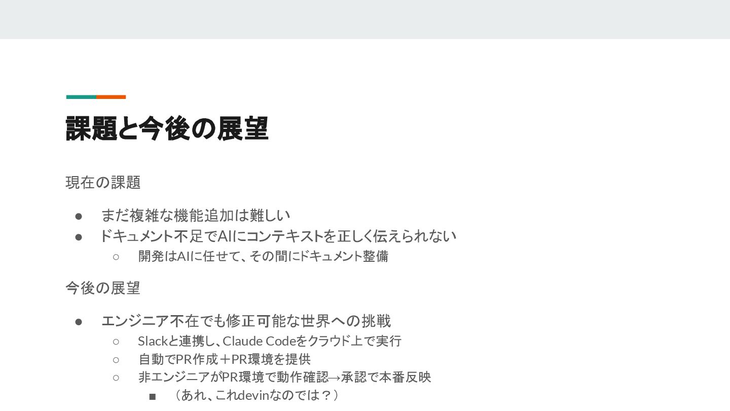 現在の課題 • まだ複雑な機能追加は難しい • ドキュメント不足でAIにコンテキストを正しく伝えられない ◦ 開発はAIに任せて、その間にドキュメント整備 今後の展望 • エンジニア不在でも修正可能な世界への挑戦