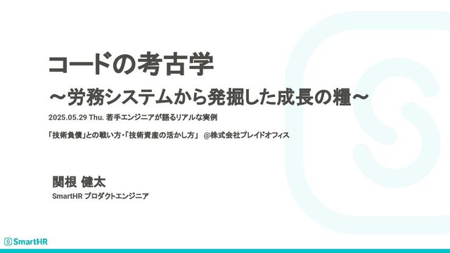 コードの考古学 〜労務システムから発掘した成長の糧〜 2025.05.29 Thu. 若手エンジニアが語るリアルな実例 「技術負債」との戦い方・「技術資産の活かし方」 @株式会社プレイドオフィス 関根 健太 SmartHR